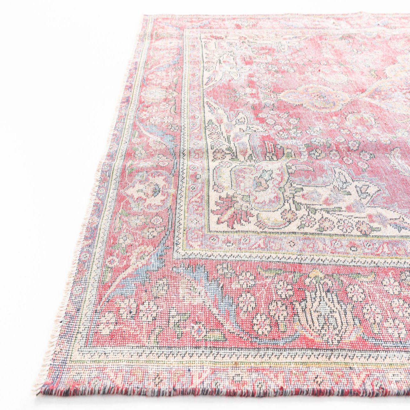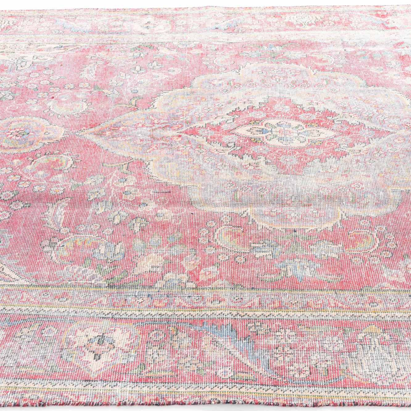 A classic Persian-inspired medallion anchors a warm red field, surrounded by scrolling floral arabesques and a multi-band floral border. Light blue, beige and ivory tones soften the design while small black accents define the motifs, giving the pattern a balanced, lived-in presence. Hand-knotted from 100% wool, the surface has a low, gently distressed pile with subtle variations in knotting and color that you can feel beneath your fingers—soft yet firm underfoot with a muted, low-sheen finish.