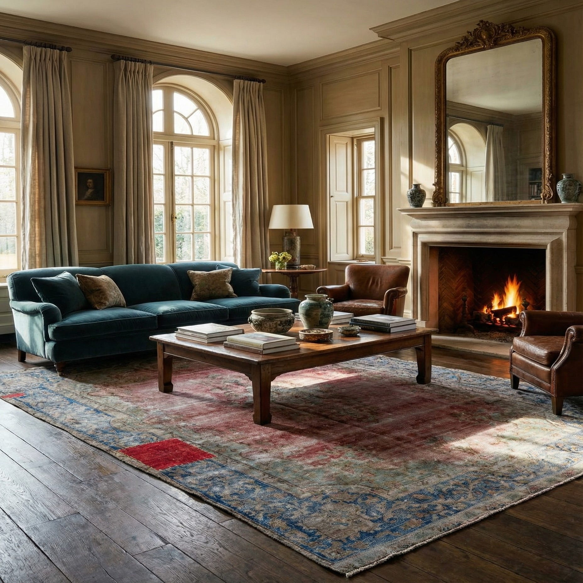 This rug's balanced proportions and artful wear make it an excellent choice for anchoring living rooms, dining areas, or libraries, adding a layer of warmth and historical charm. Its substantial wool construction ensures durability, making it well-suited to high-traffic areas while also providing a soft and inviting surface underfoot.