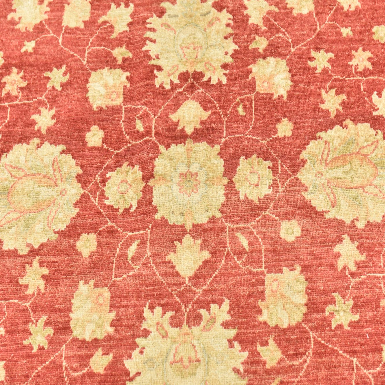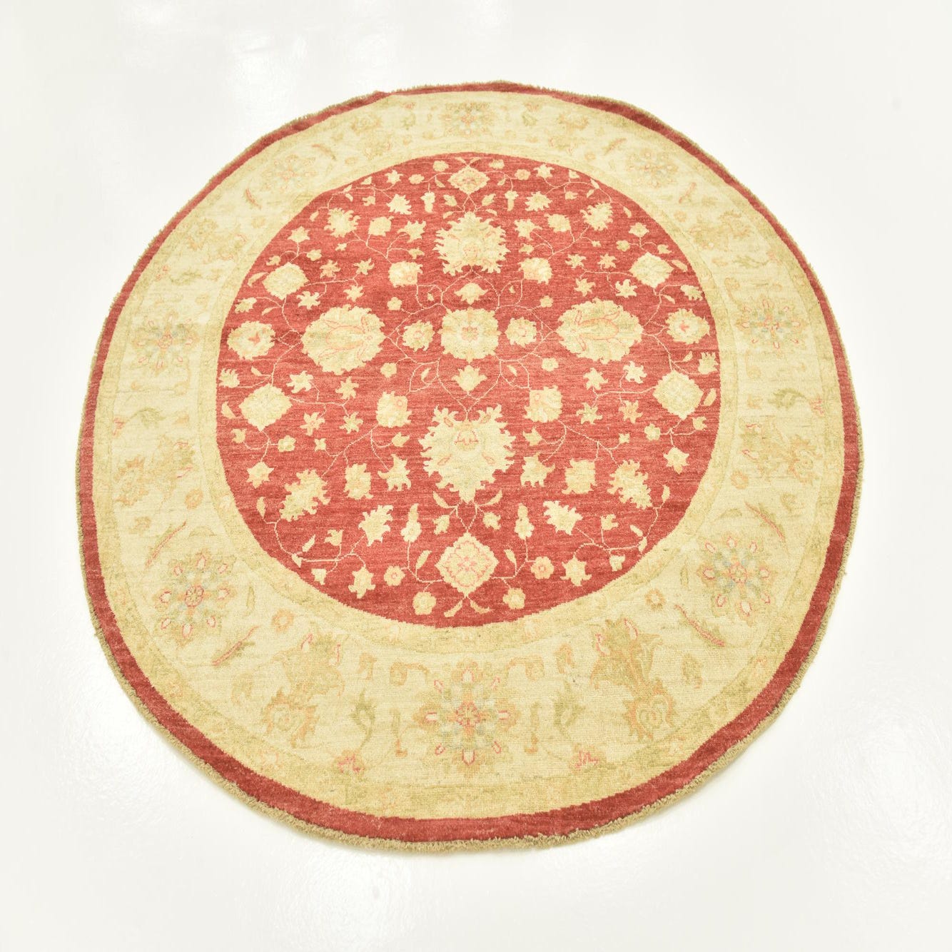 The Peshawar Ziegler rug, hand-knotted from 100% hand-spun wool, presents a traditional design enriched by a harmonious blend of warm and inviting colors. Spanning 7 feet in diameter, this round rug features an alluring red background, layered with an array of floral and vine motifs in softer hues of beige, light blue, light green, light brown, and orange. The pattern is balanced and intricate, evoking a sense of timeless elegance and craftsmanship.
