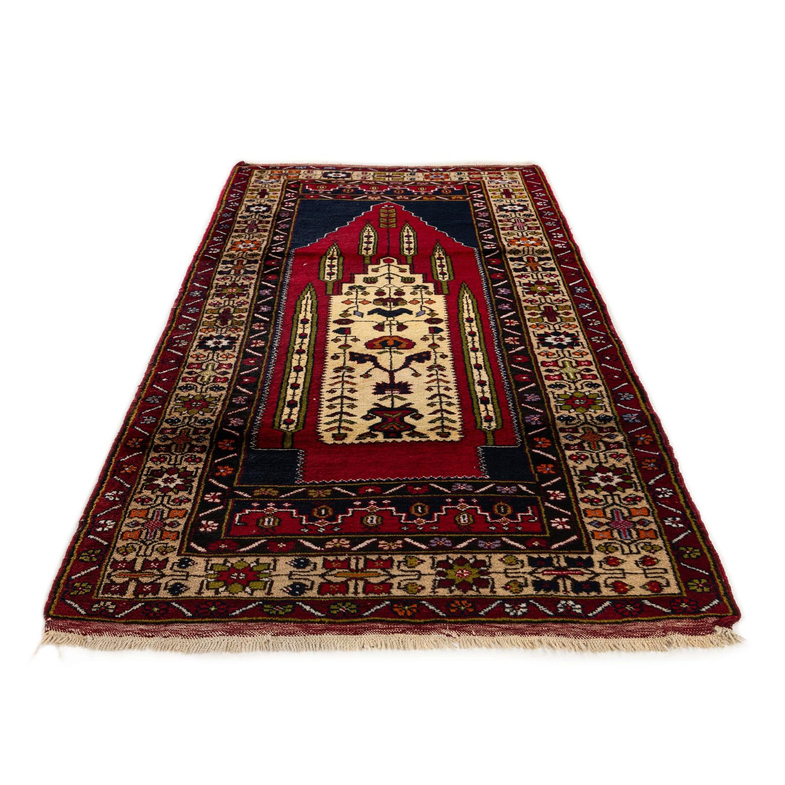 Primary color is Red. Colors in this rug include: Red, Ivory, Navy Blue, Yellow, Olive, Orange, Violet.