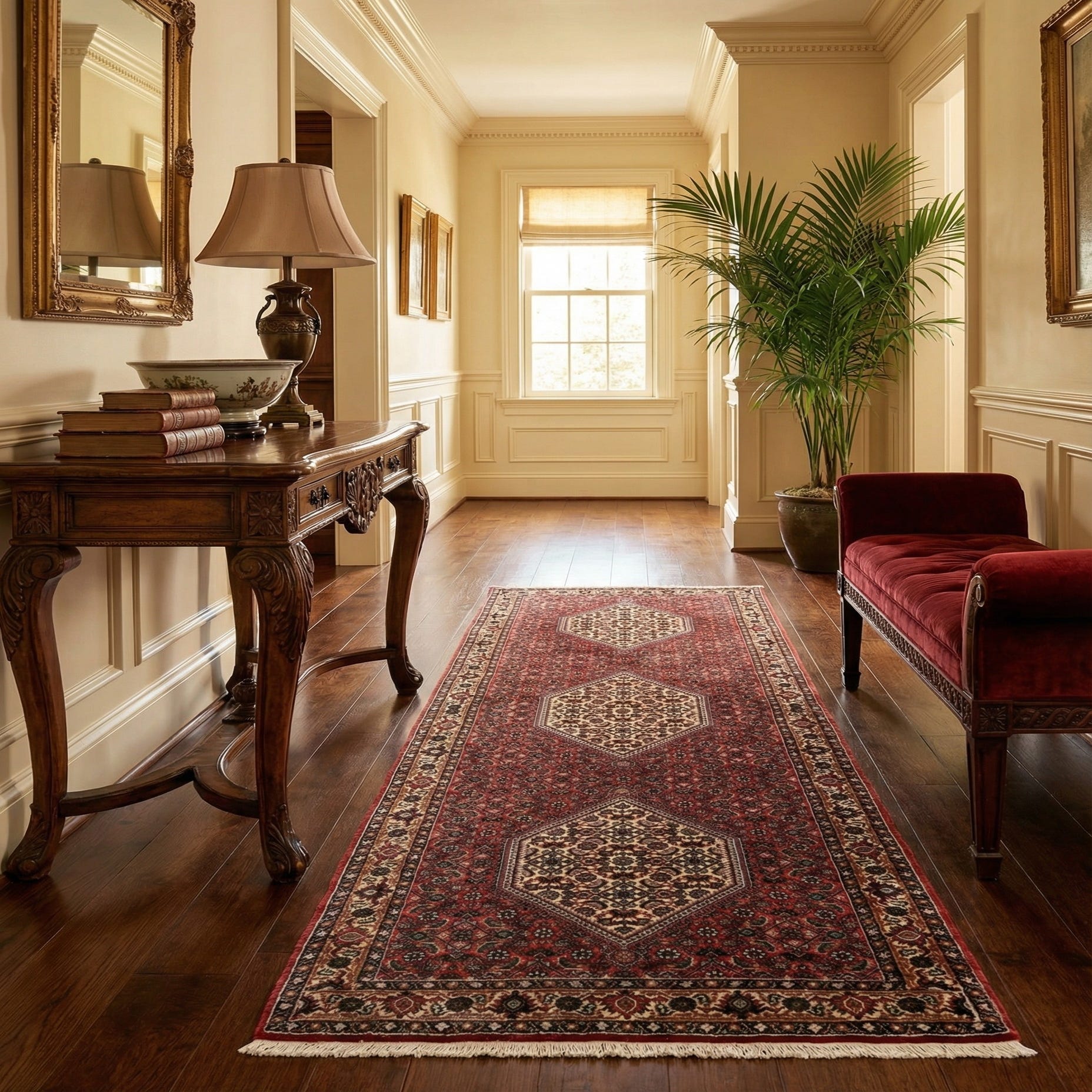 A 7 ft runner rug in a traditional Persian style, featuring a rich red field with intricate floral motifs and three cream-colored medallions.