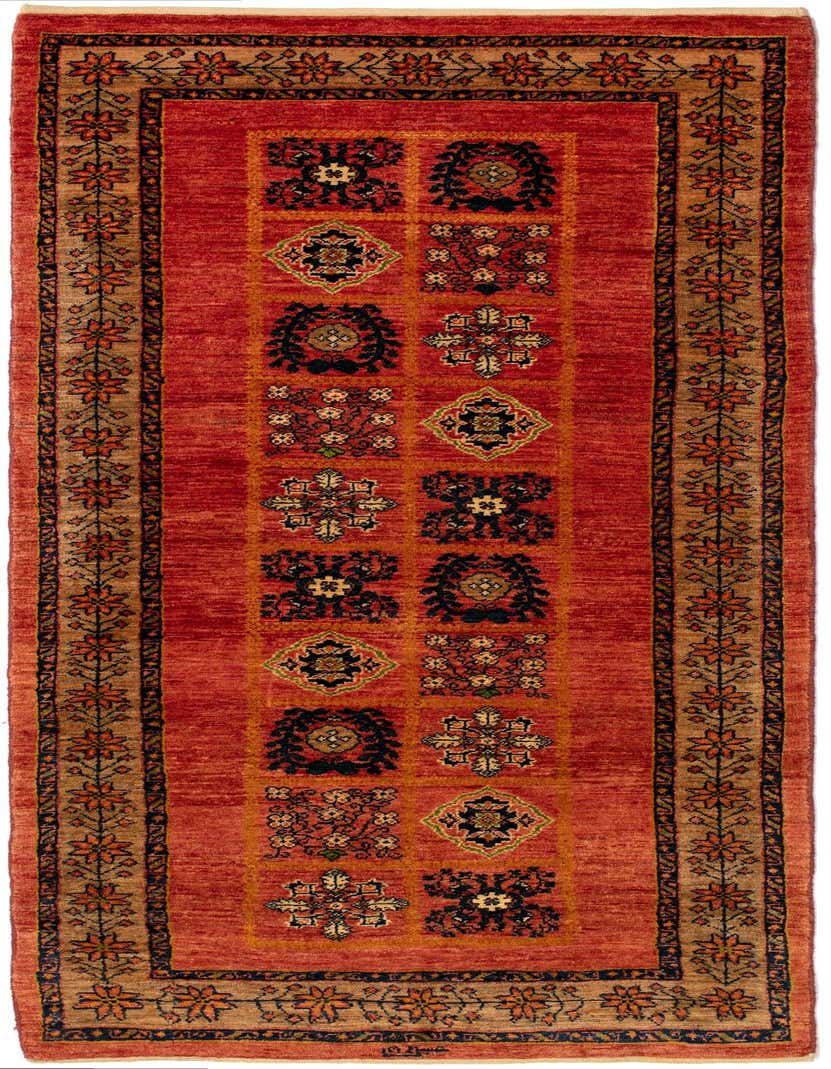 Primary color is Red. Colors in this rug include: Red, Orange, Black.