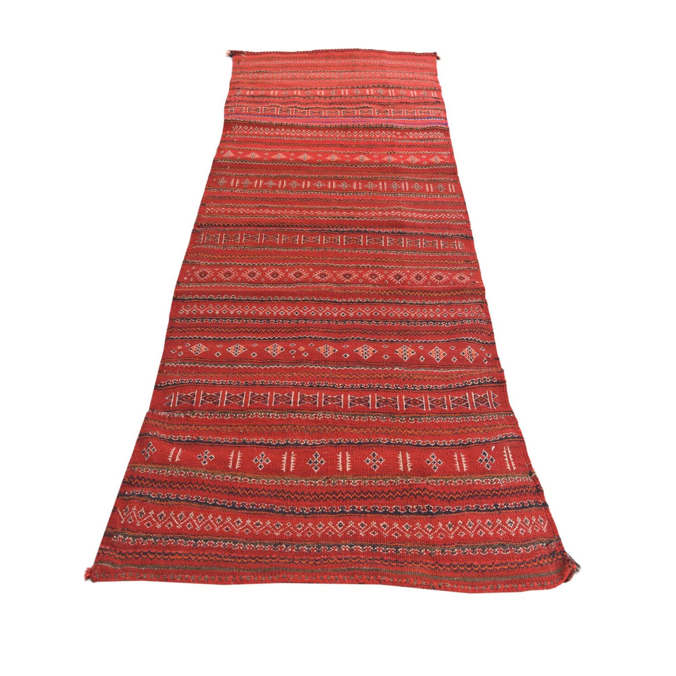 Hand-woven of 100% wool in a traditional kilim flatweave, this runner places a bold red field beneath a steady rhythm of narrow horizontal bands. Geometric motifs — small diamonds, cross-like emblems and zigzag borders — alternate with thin stripe rows in black, ivory and orange, creating a structured, tribal-inspired pattern. The low-profile surface reads as subtly textured, with a firm, tactile weave that offers a warm, natural hand underfoot.
