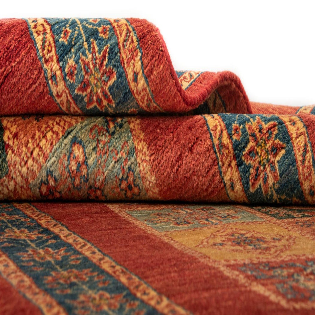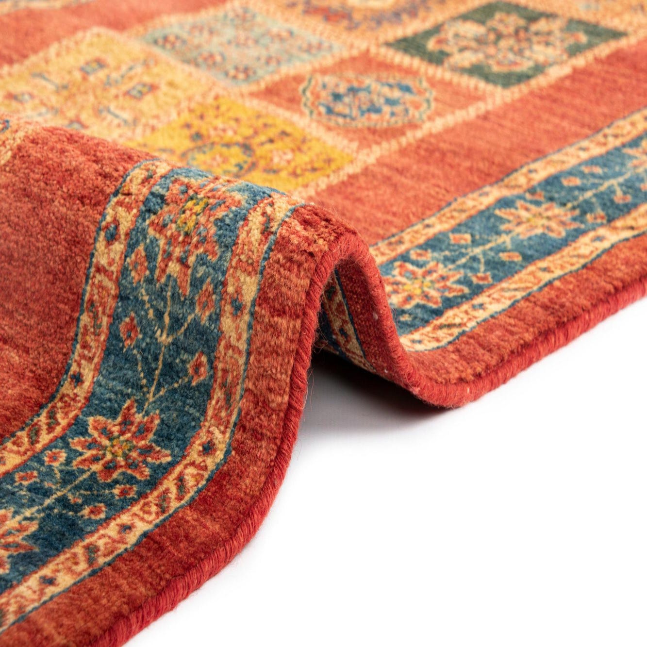 The Luribaft collection presents a vibrant 7 Ft Runner, hand-made from 100% wool, showcasing a dynamic array of colors set against a red background. This runner features a harmonious composition of geometric and traditional motifs, with distinct squares containing star and diamond patterns. The color palette includes red, blue, beige, yellow, green, and pink, all of which contribute to the rug's warm and inviting appearance.