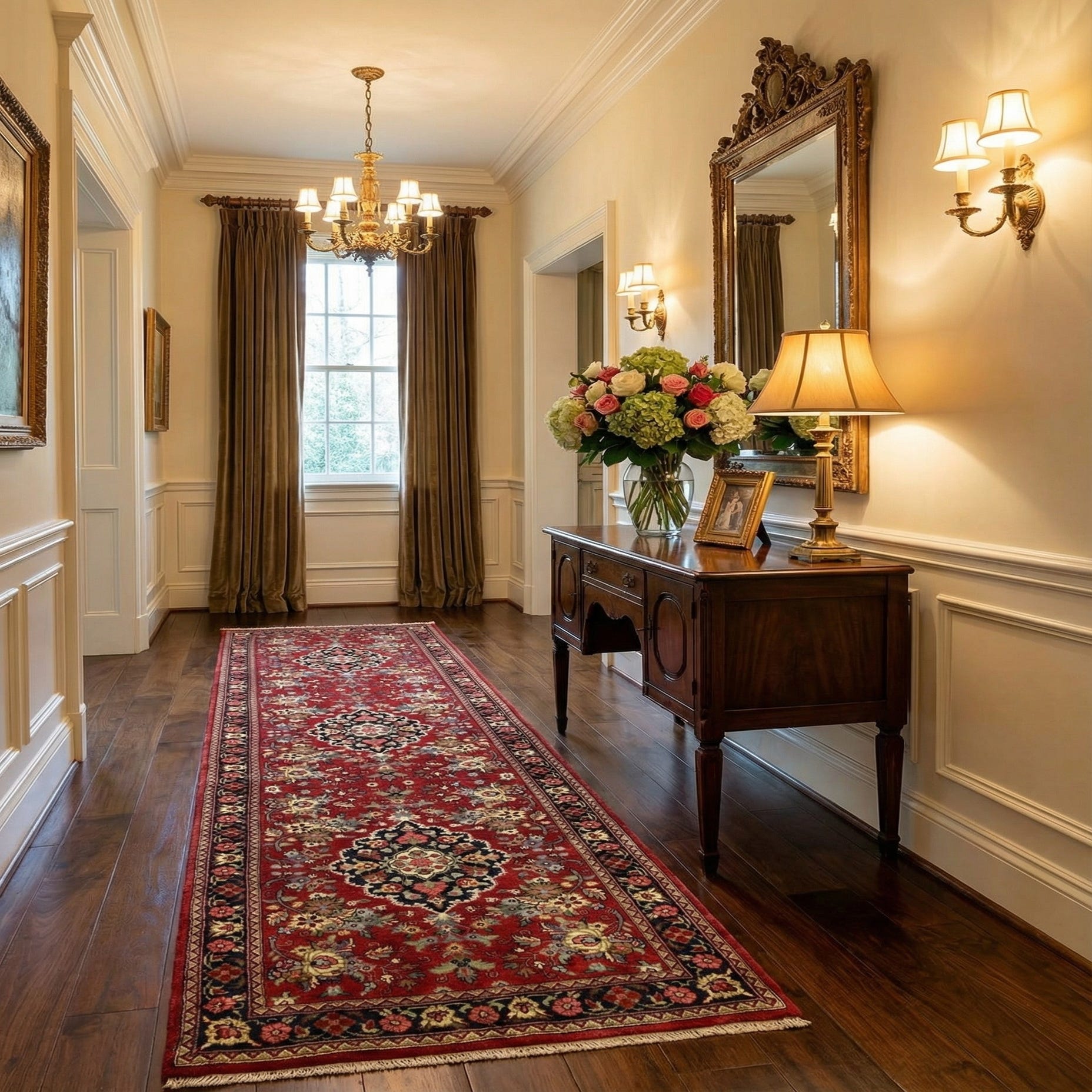 A 7 ft red Persian runner rug with intricate floral and medallion patterns in navy, gold, and pink, ideal for a hallway.