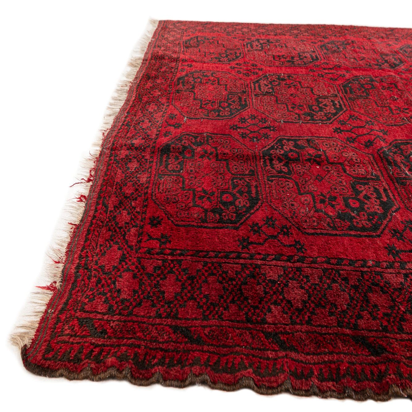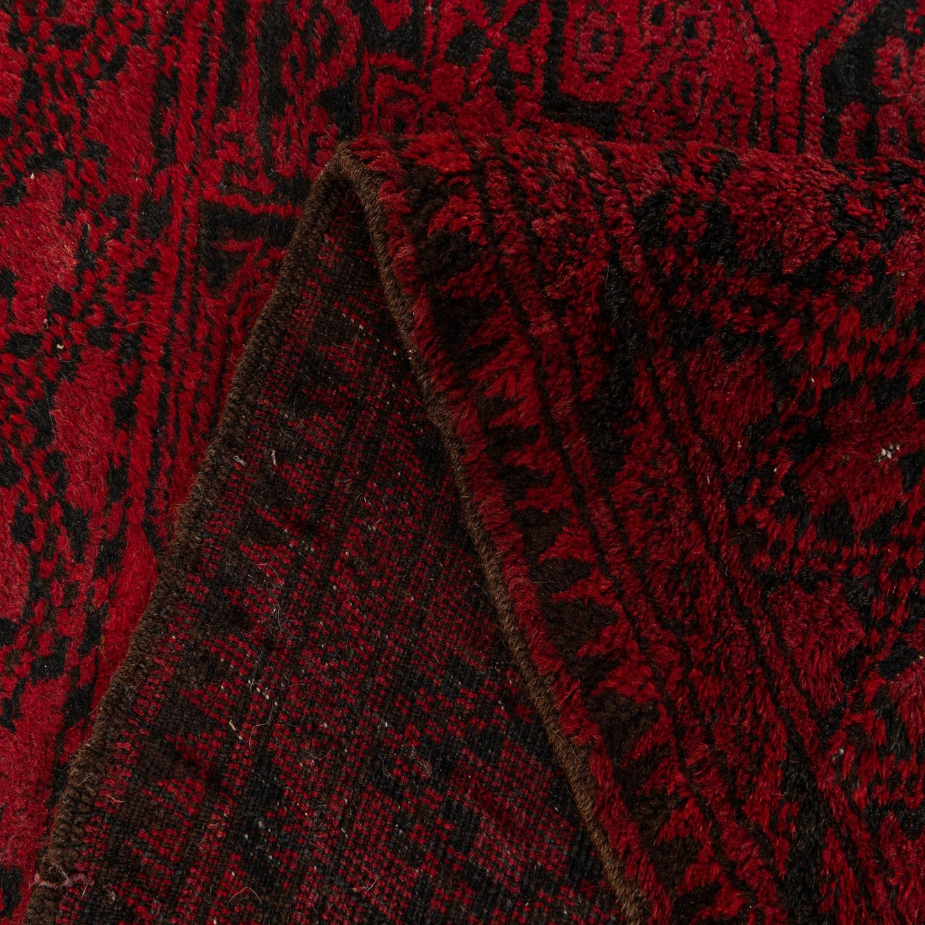 A square 6' 6 x 7' 0 Balouch wool rug featuring a traditional tribal pattern of black medallions on a deep red background.