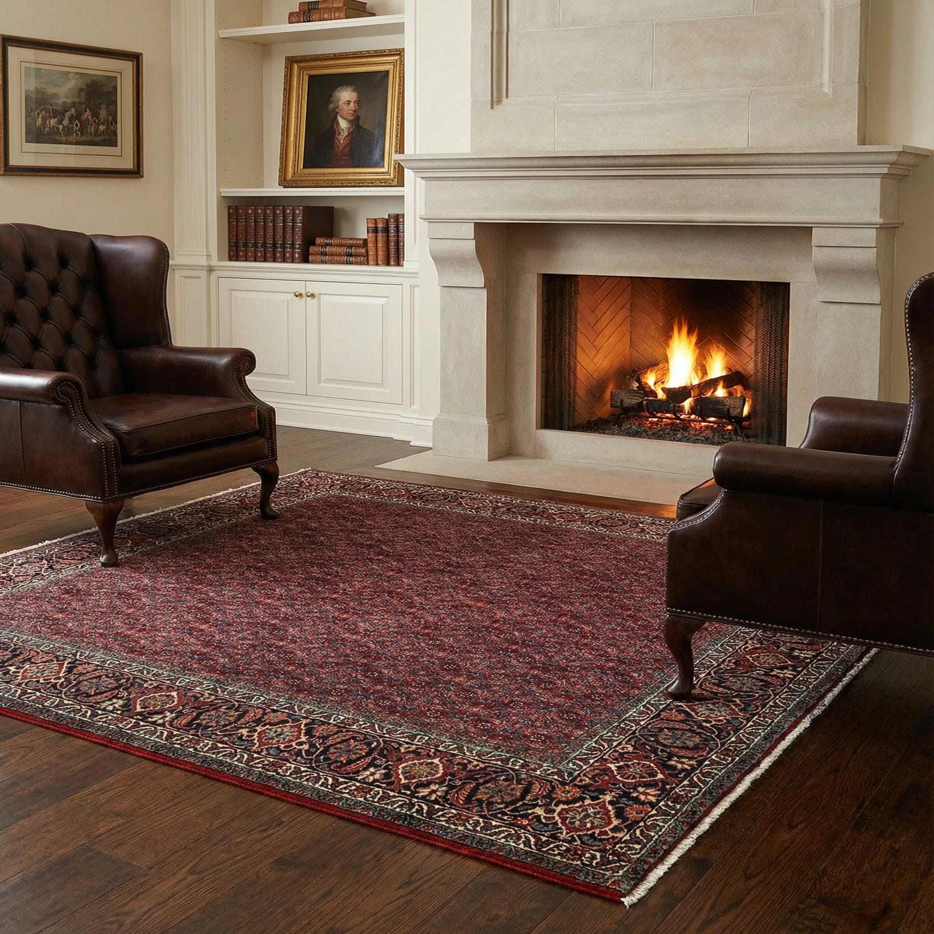 The classic style and rich colors of this piece make it suitable for a variety of interior design scenarios. It complements an array of decors, particularly traditional, vintage, and eclectic settings. The rug can serve as a focal point in a living room, grounding furniture with its strong visual presence, or in a dining room, adding warmth and timeless elegance. The Bidjar rug's substantial size and square shape also make it an excellent choice for large entryways or under square dining tables, imbuing the space with a sense of history and sophistication.