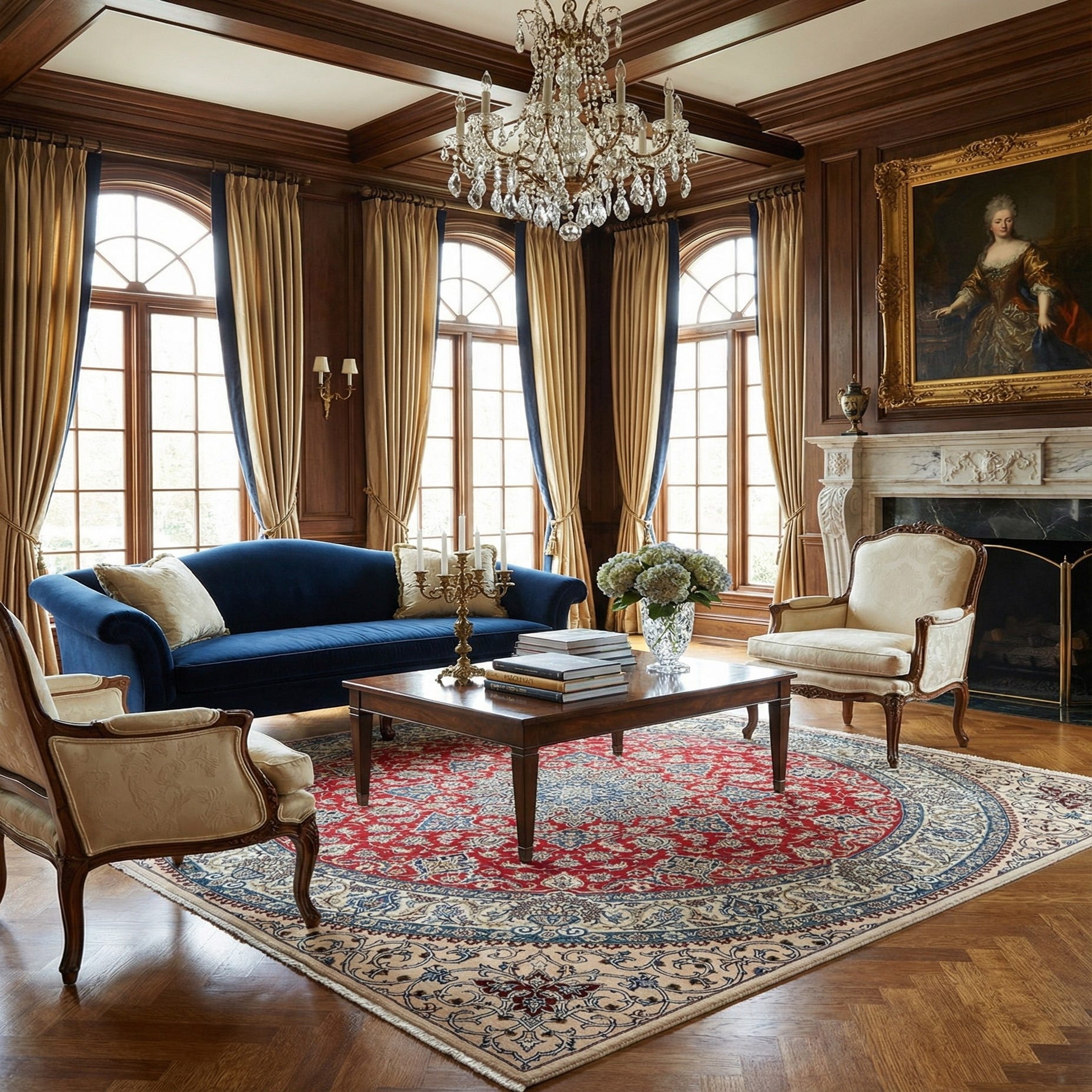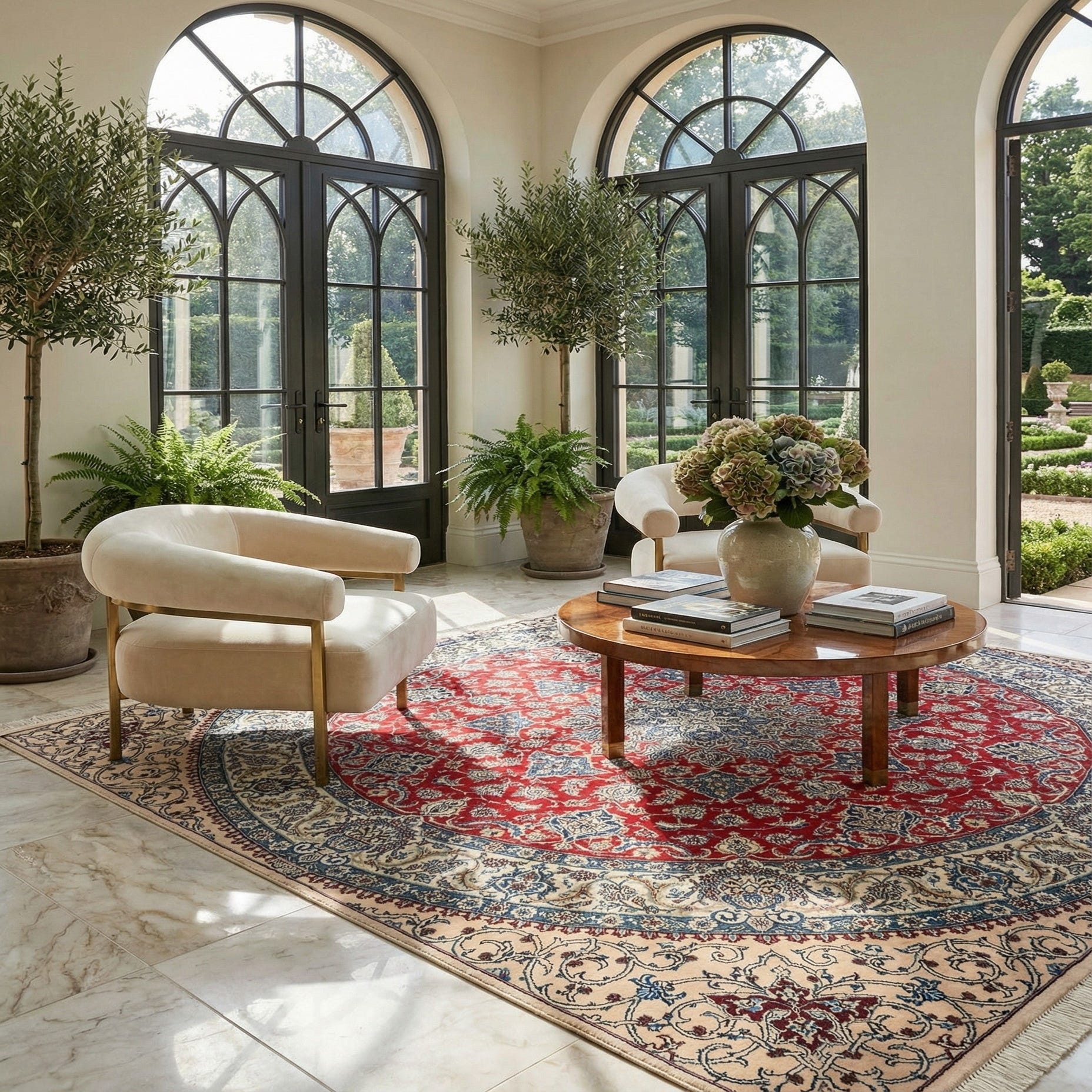 A square 7' 3" x 7' 5" Persian rug with a vibrant red central medallion and intricate blue and cream floral patterns.
