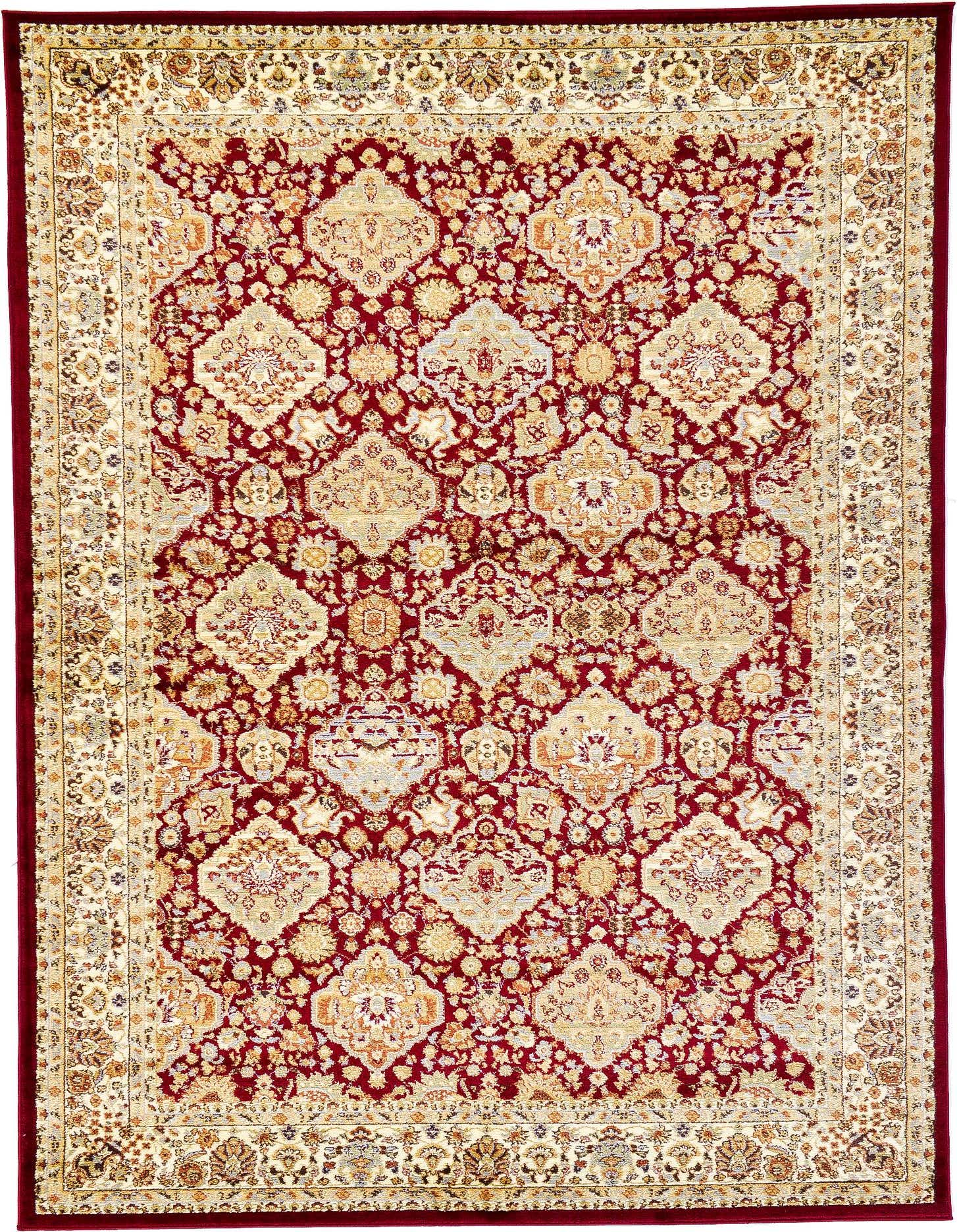Primary color is Red. Colors in this rug include: Red, Cream, Light Blue, Light Green, Brown, Peach.