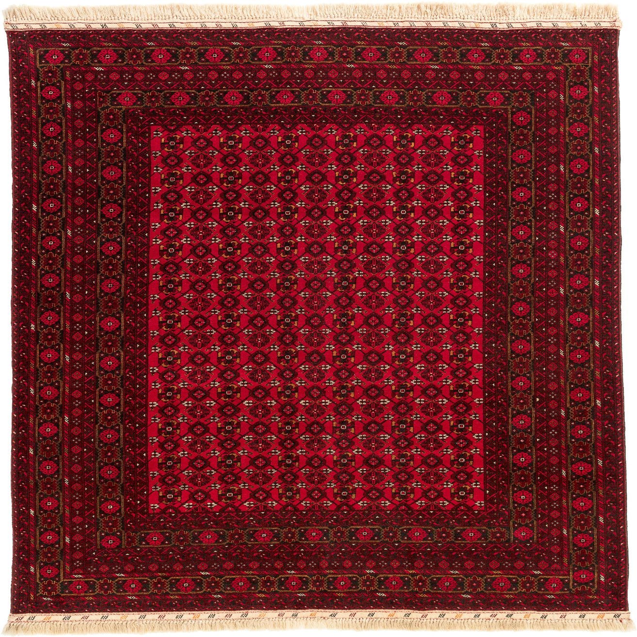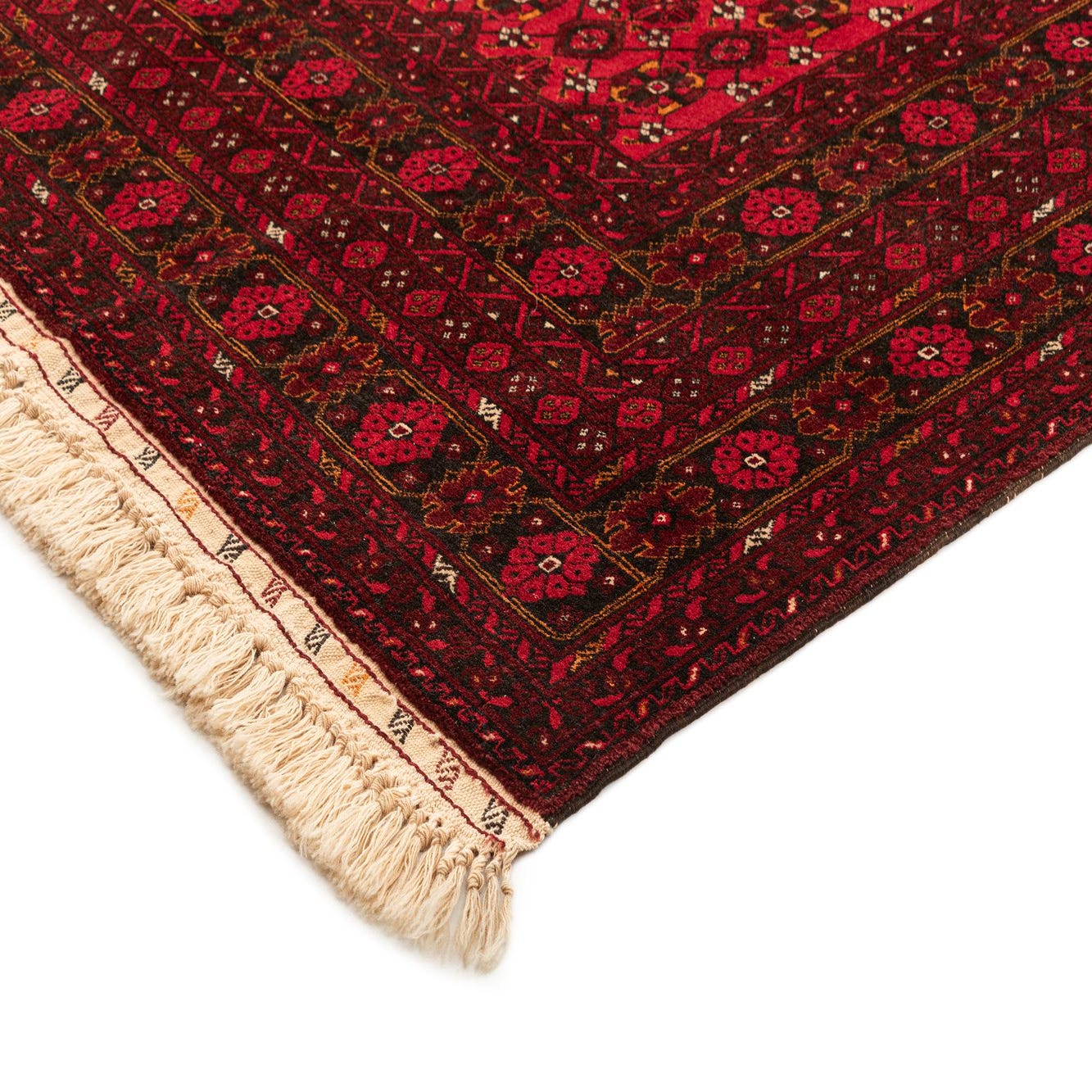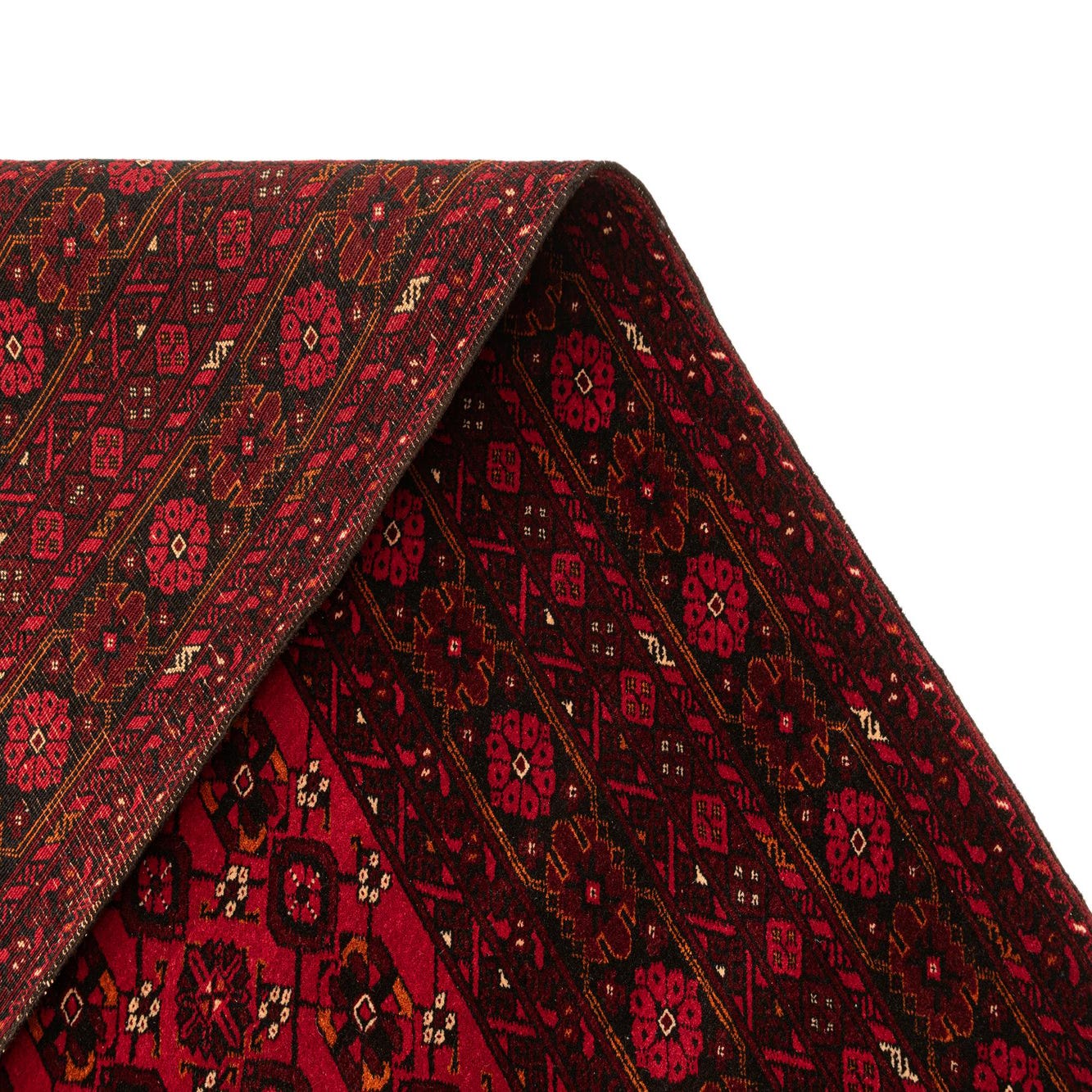 A 7x10 rectangular Rugs.com Afghan Akhche rug in deep reds with a traditional tribal pattern and thin pile, featuring intricate borders.