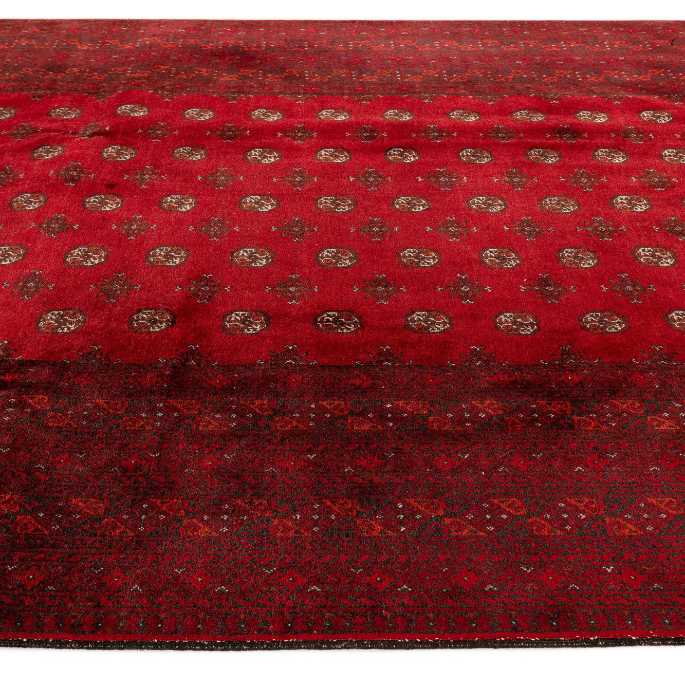 A 7x10 rectangular Afghan Akhche rug in deep reds, featuring a traditional tribal pattern with geometric medallions and a multi-bordered design.