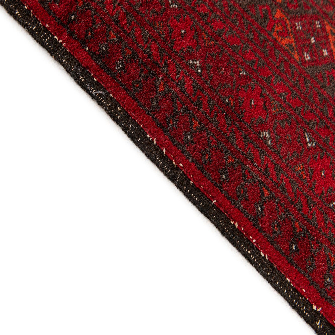 Primary color is Red. Colors in this rug include: Red, Black, Orange, Ivory.