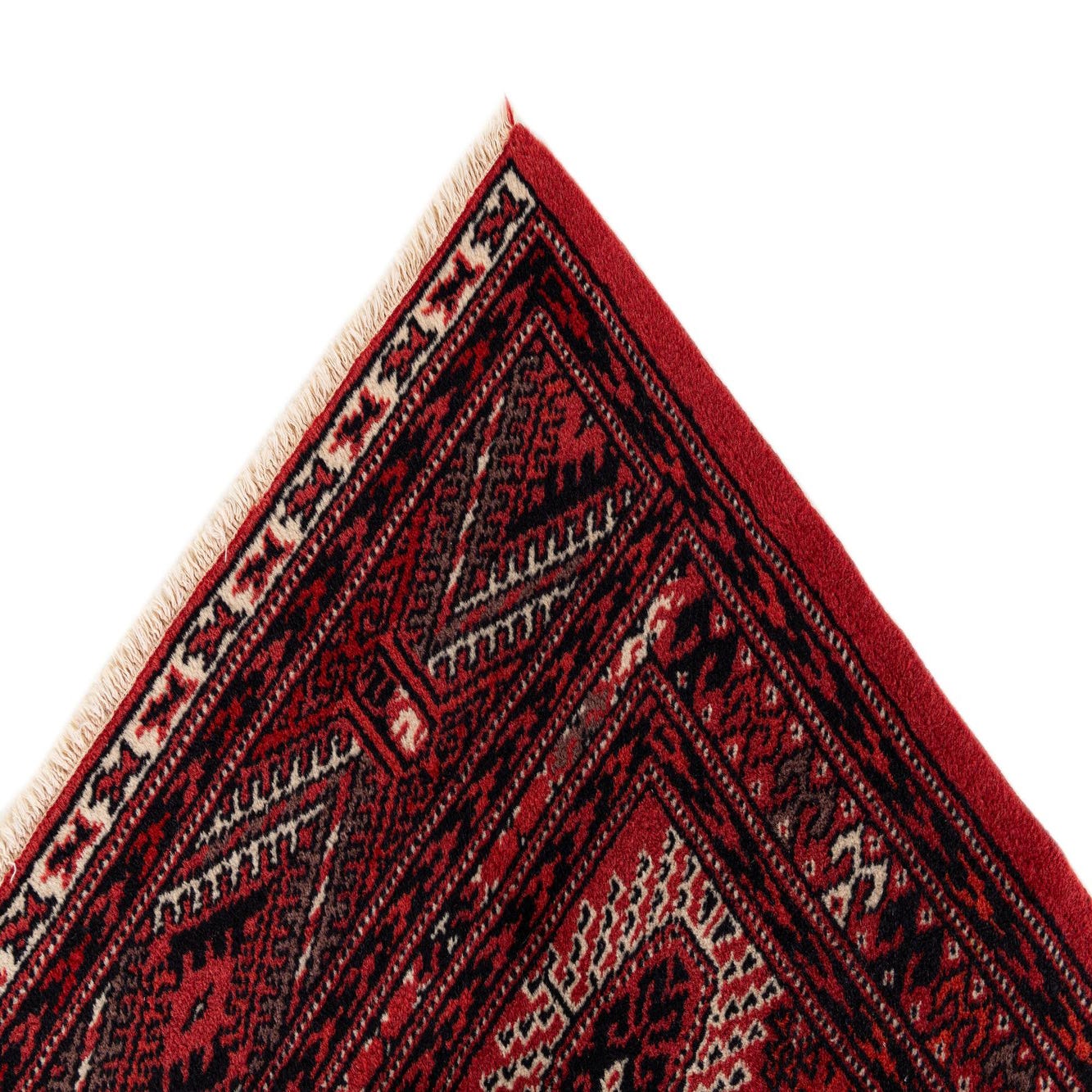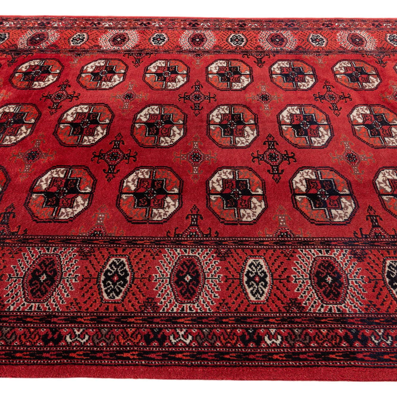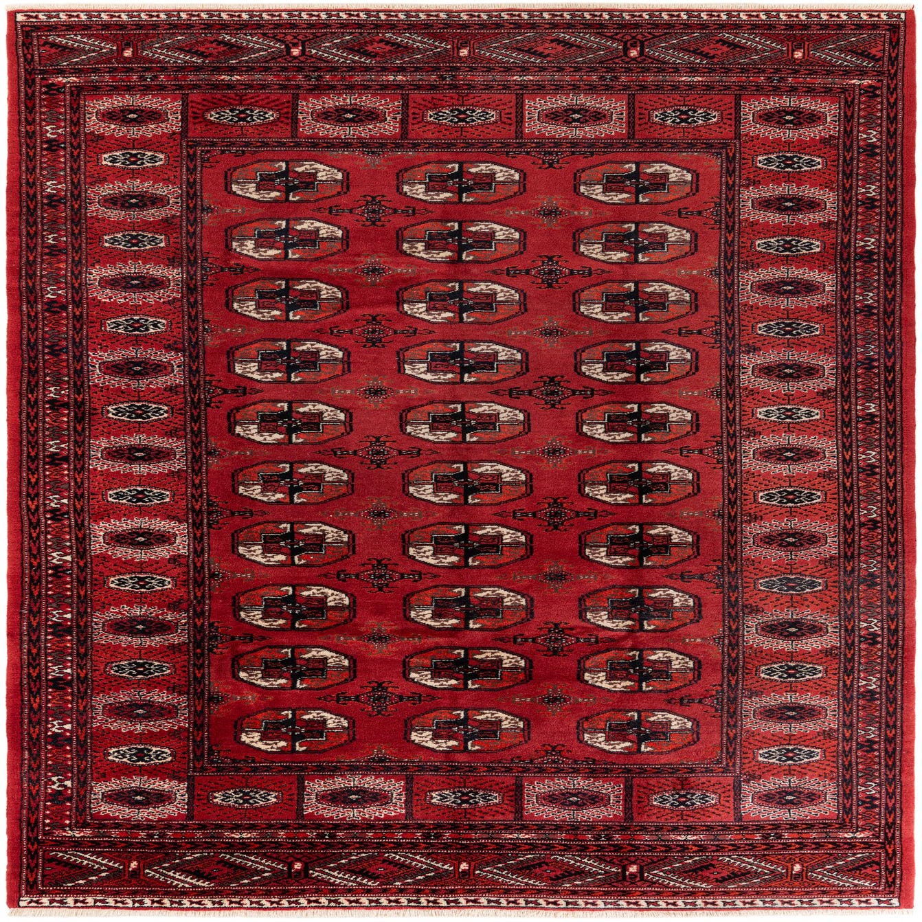 A 7x10 rectangular Afghan Akhche rug in deep red, featuring traditional tribal patterns with black and cream accents.