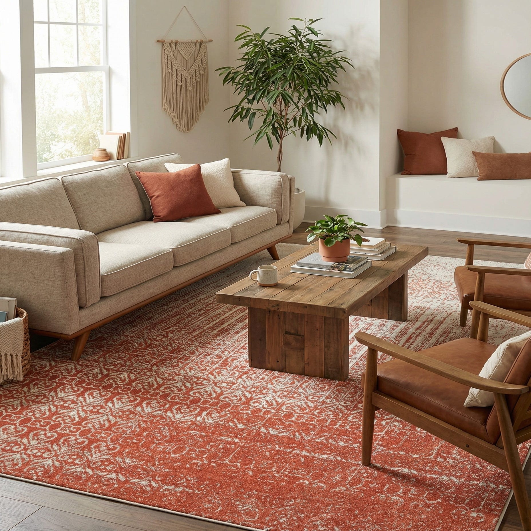 The Angelica collection offers a 7x10 area rug that features a captivating blend of traditional charm and contemporary flair. This machine-woven piece is crafted from 100% polypropylene, offering a soft yet durable texture that can withstand high foot traffic areas while maintaining its visual appeal. The rug showcases an engaging red background complemented with beige, terracotta, and light brown hues that create a warm and inviting atmosphere.