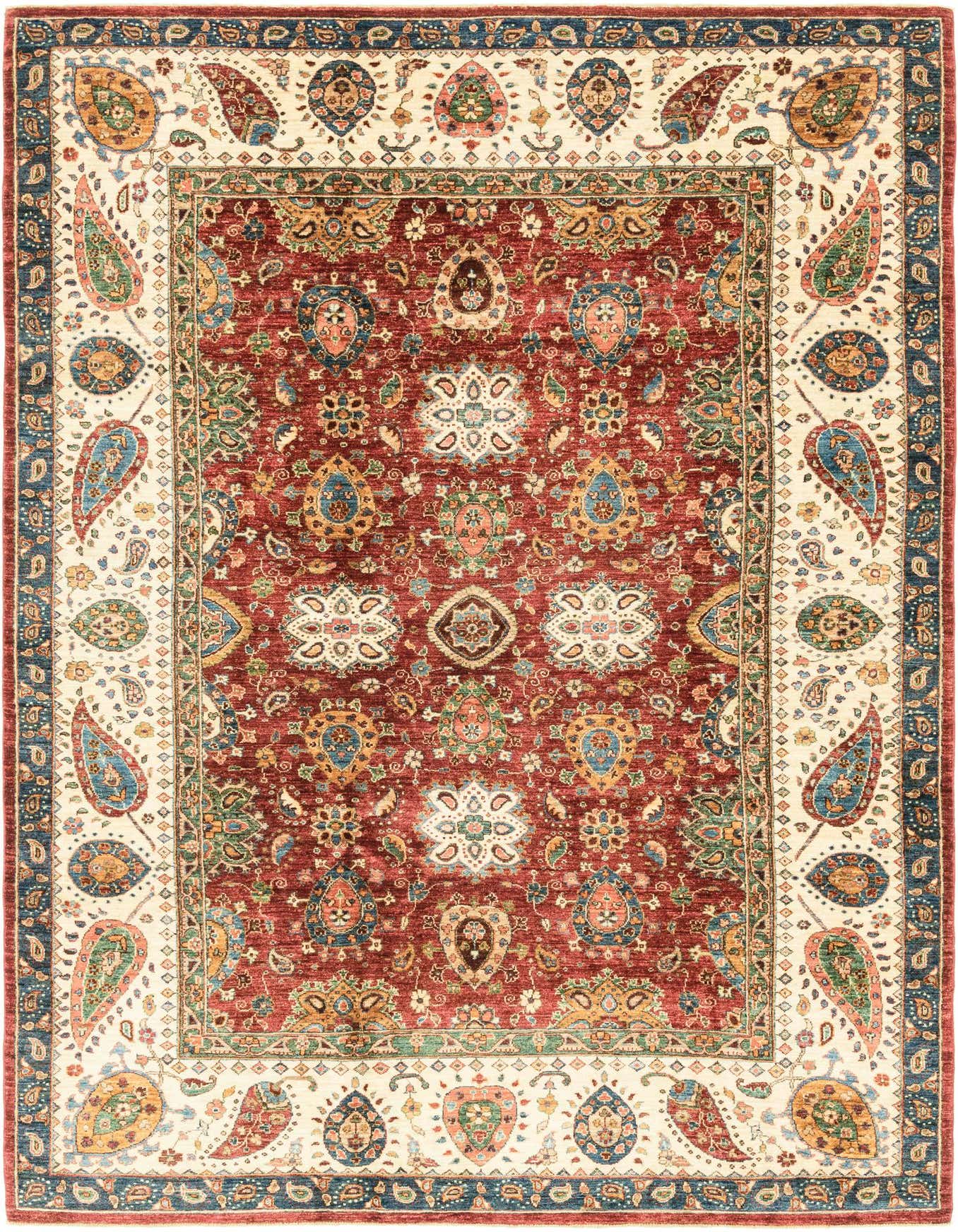 Primary color is Red. Colors in this rug include: Red, Blue, Brown, Gold, Green, Ivory, Navy Blue, Orange.