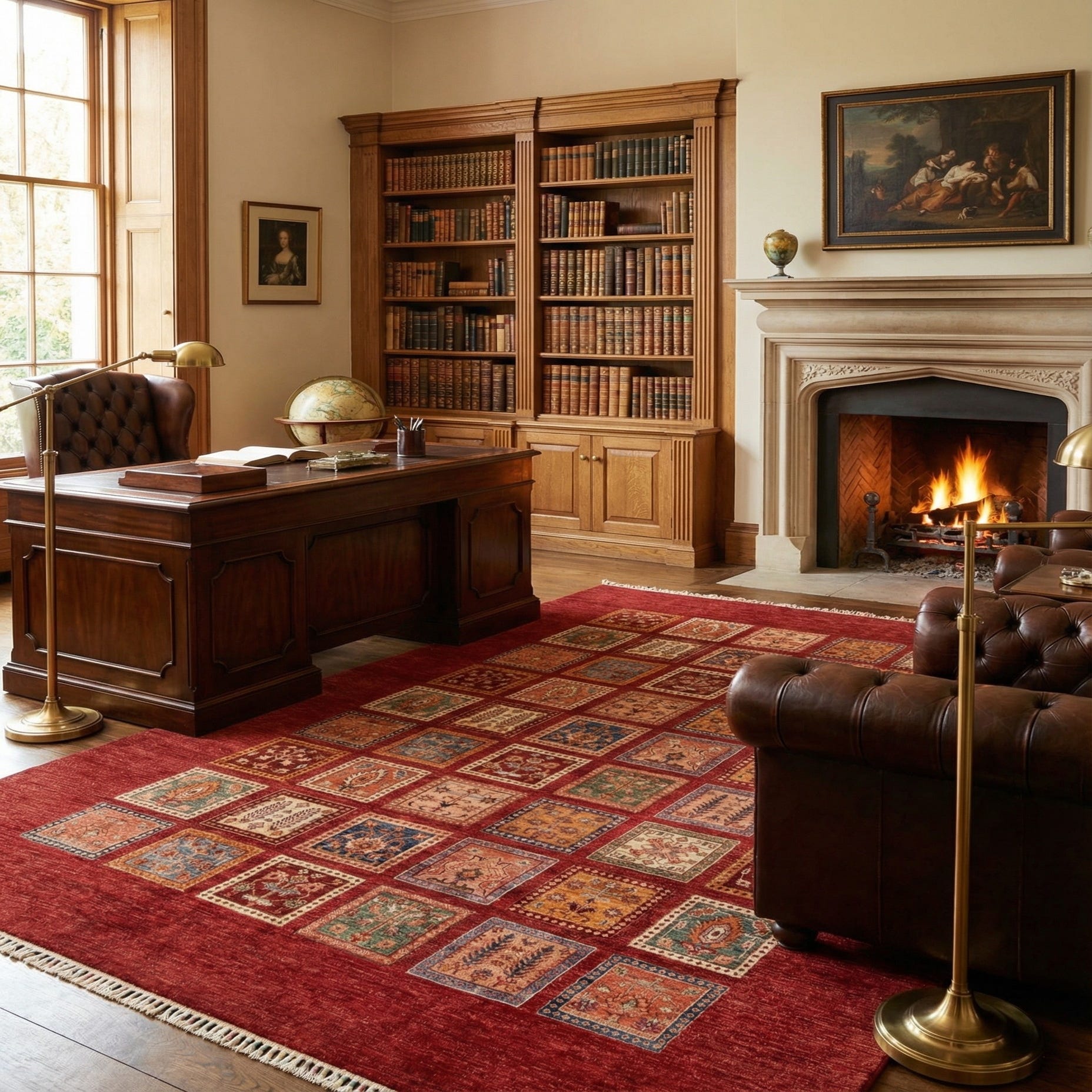 A 7x10 rectangular red tribal rug with a grid pattern of colorful oriental motifs, suitable for a living room.
