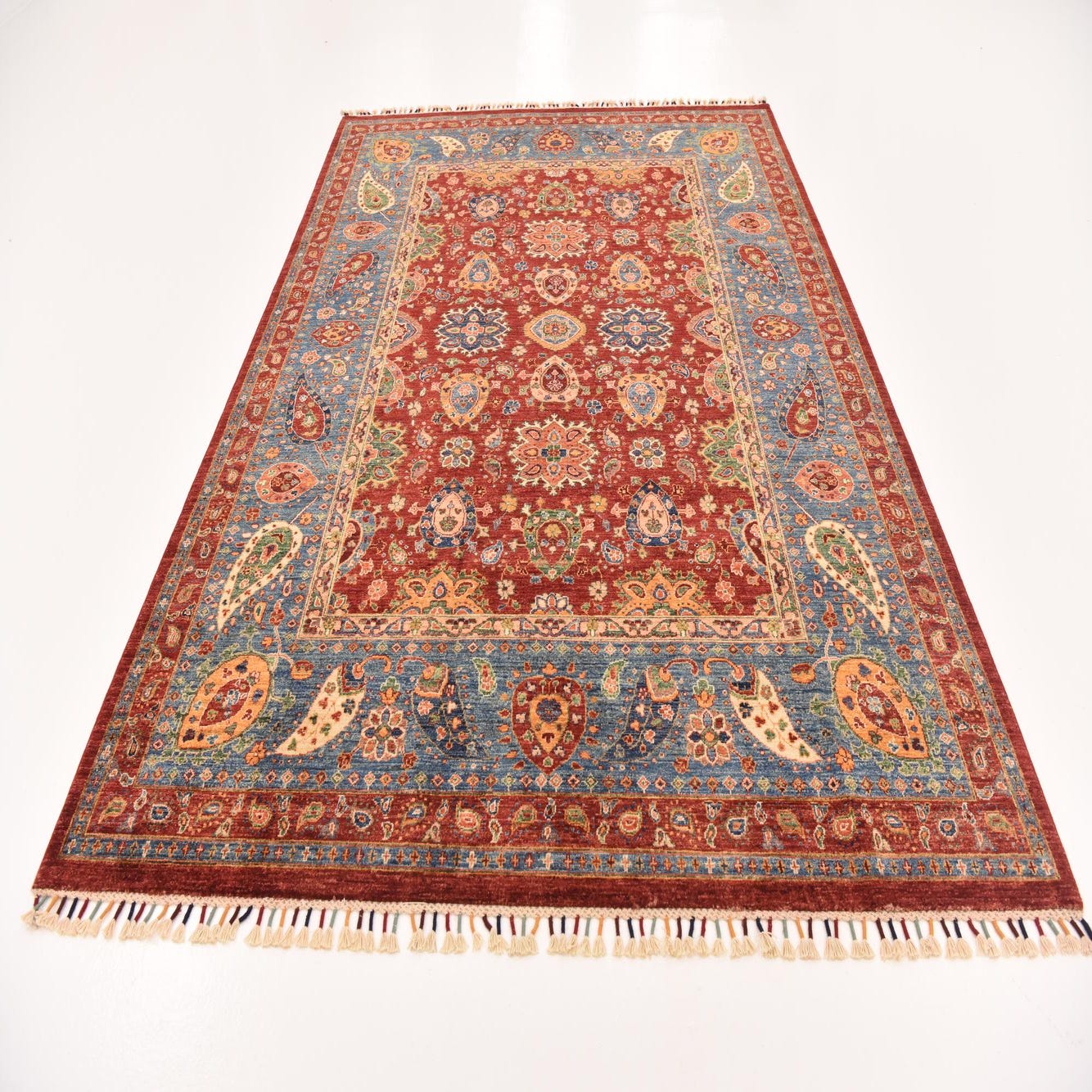 A 7x10 rectangular Ariana Ziegler rug featuring a rich red field with intricate traditional and tribal patterns, bordered by a detailed blue design, suitable for a living room.