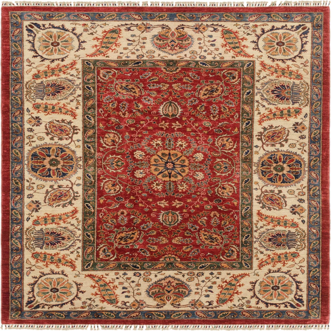 The edges of this rug are finished with fringe detailing, lending a traditional touch to the overall design. This rug's color palette and timeless pattern allow for versatility in placement; it would serve as a focal point in a living room with warm wood furnishings, complement a sophisticated dining area, or add character to an office space that benefits from an infusion of classic style. The hand-spun wool texture pairs well with leather upholstery, rich velvets, and various wood finishes, making it a suitable choice for interiors that favor a touch of the old-world charm.
