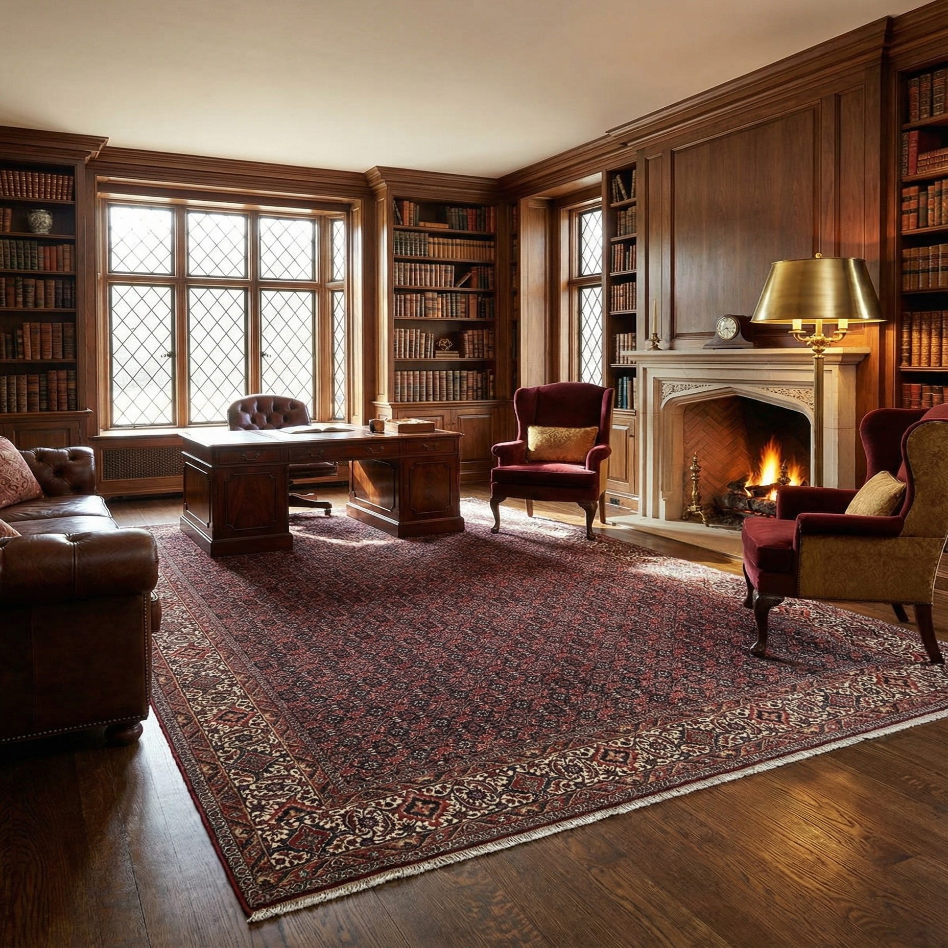 A 7x10 rectangular Bidjar Persian rug in deep reds with intricate floral patterns and a detailed border.