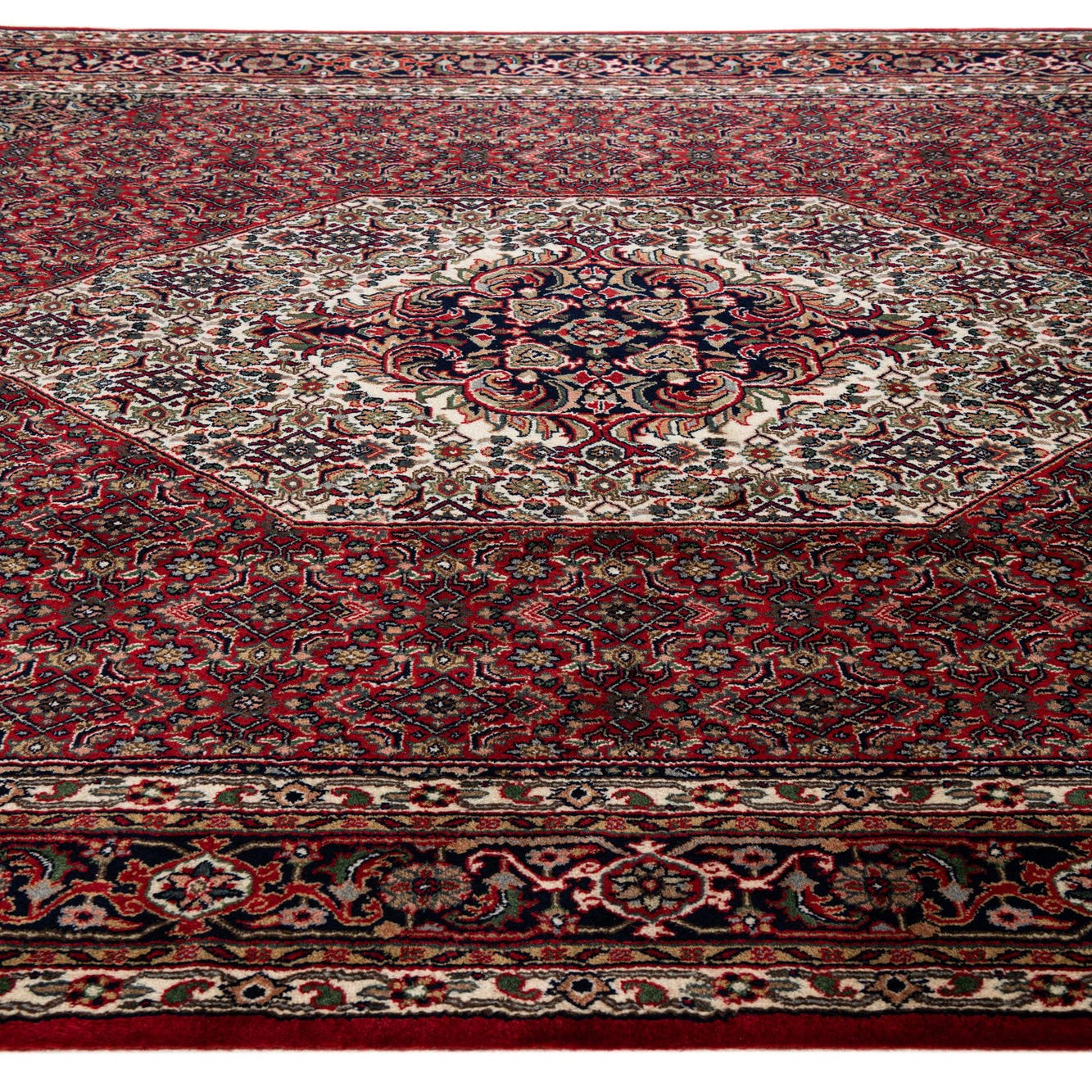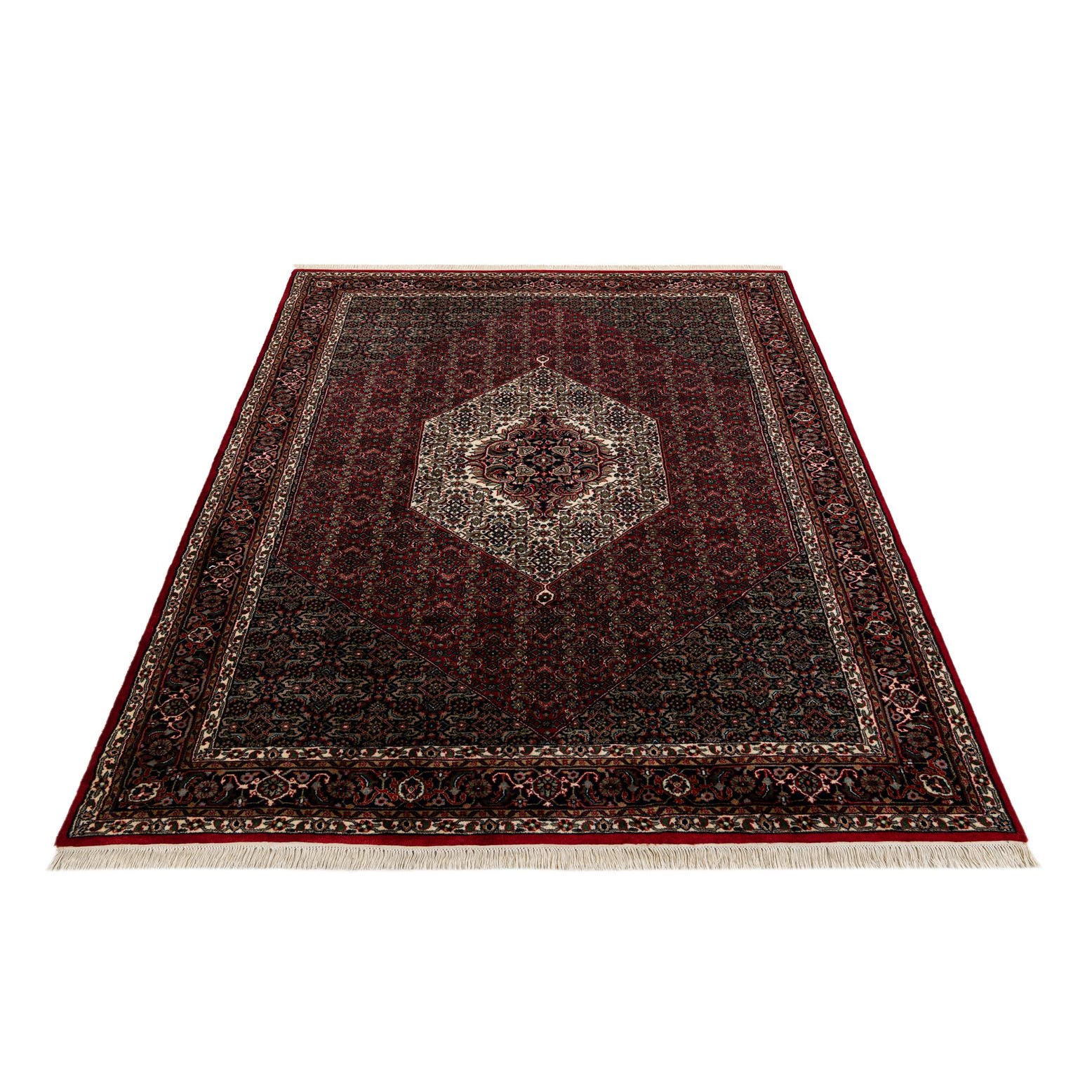 A 7x10 rectangular Bidjar rug featuring a traditional Oriental medallion pattern in rich reds, black, and cream, ideal for a living room.