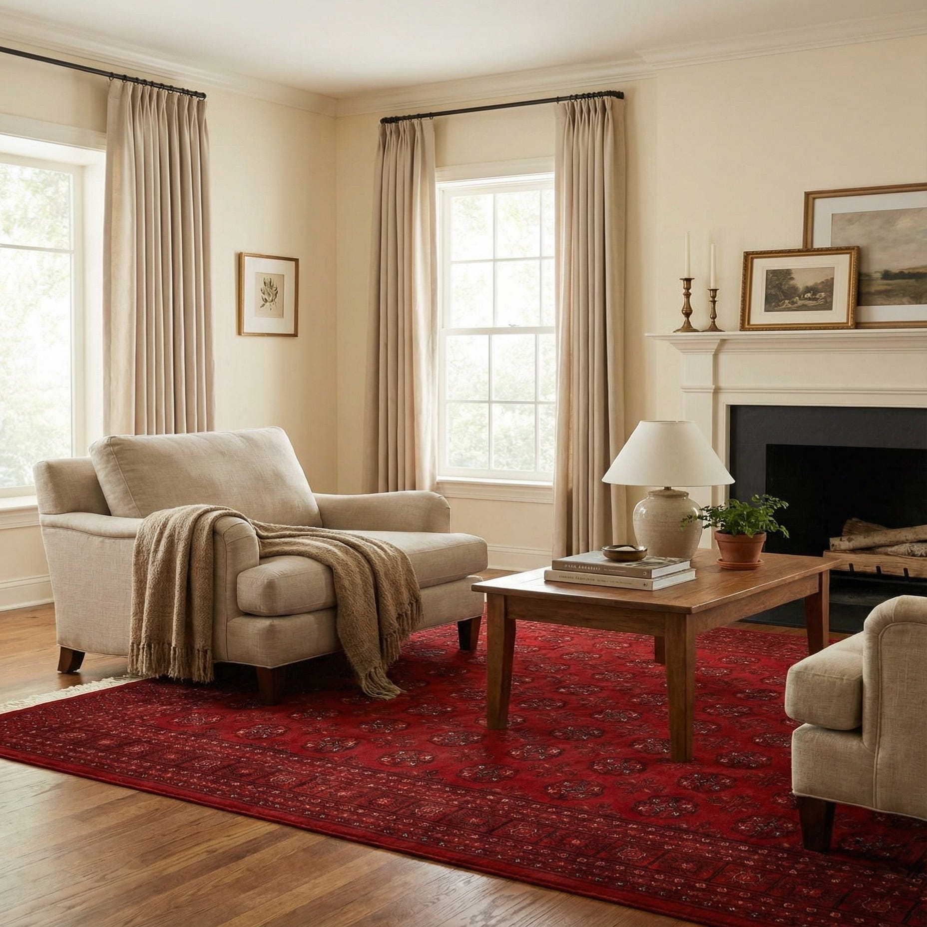This rug suits settings that lean traditional or transitional: place it under a seating group to ground a living room, beneath a dining table to introduce rich color, or layer it in a study or library for added warmth. It pairs well with warm wood furniture, leather upholstery, neutral linens and black metal accents; terracotta accessories and cream textiles will echo the rug’s secondary hues for a cohesive look.