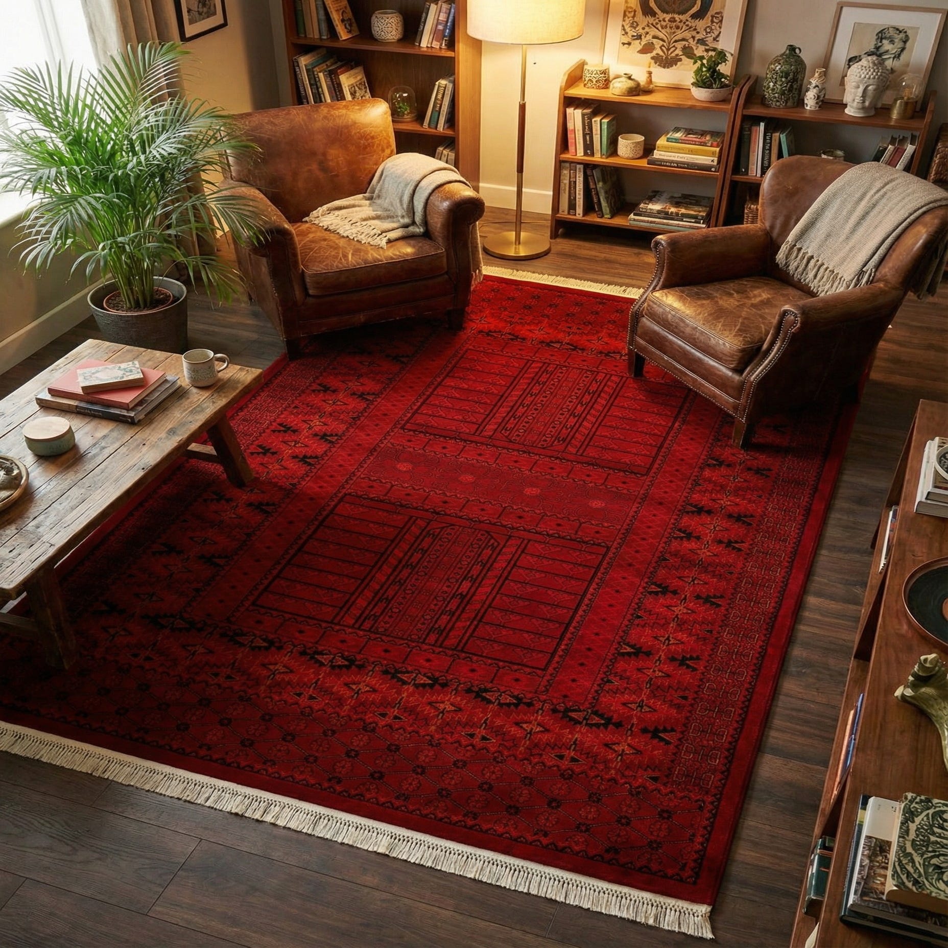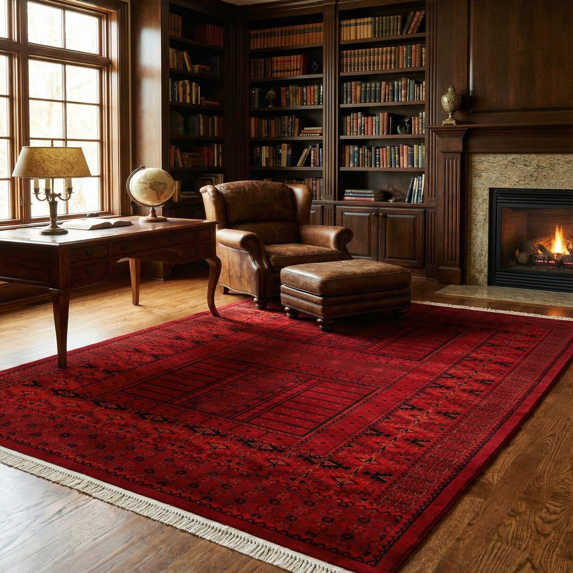 This piece anchors a seating area or reading nook beautifully, pairing especially well with warm wood furniture, leather upholstery, or layered textiles in neutral or deep tones. It also works as a bold accent beneath a small dining table, in a study, or in an entry where the strong red ground and black detailing bring structure and color to the room. The timeless geometric motifs complement both classic and mid-century modern interiors and can soften industrial spaces with the rug’s warm palette.