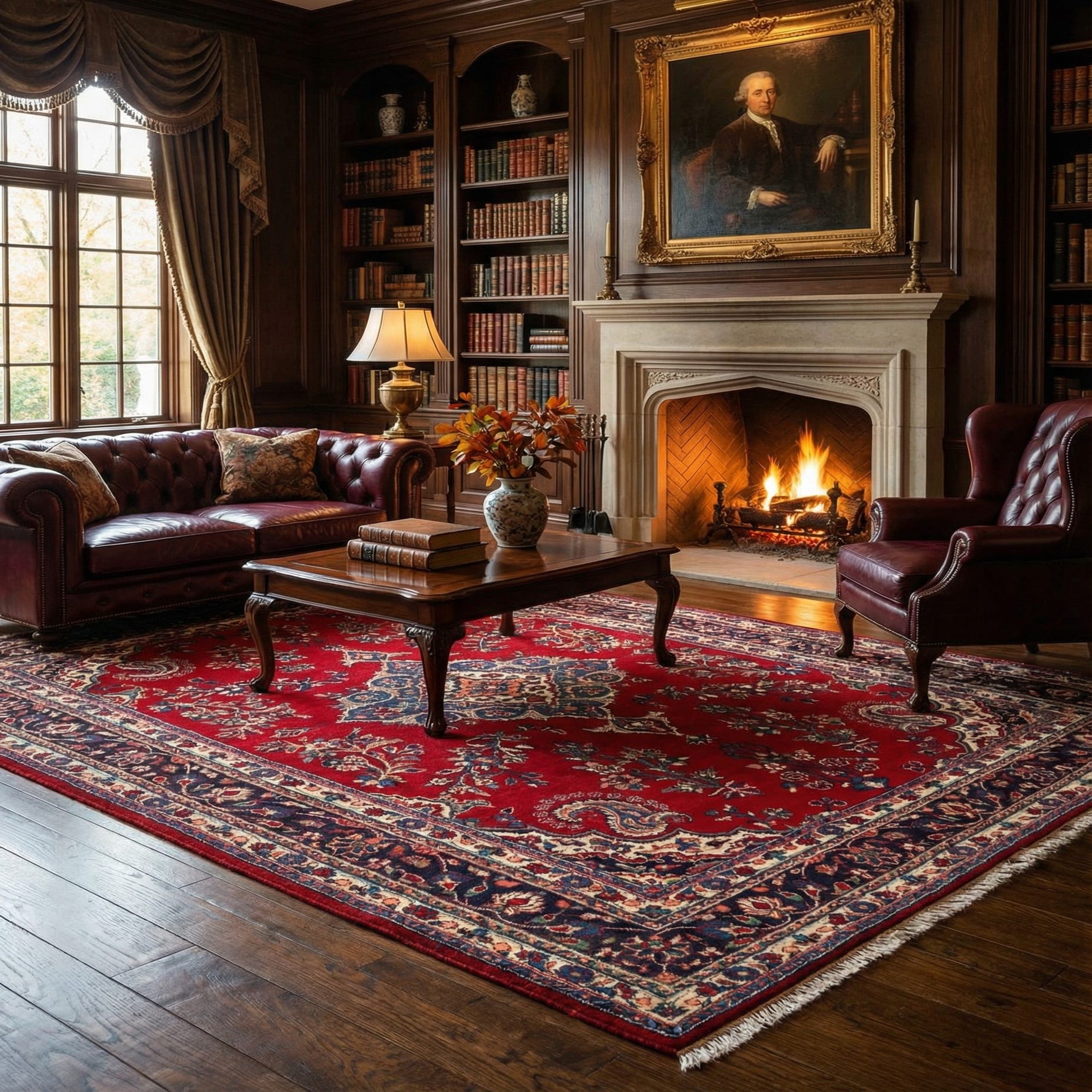 A rich red field sets the stage for a classic medallion layout, the central motif worked in blue and dark blue and set against cream spandrels. Floral vines, sprigs and palmettes in cream, brown, green and soft pink trail across the field, while a deep navy border with intricate flower-and-palmette bands frames the composition. The pattern is traditionally Persian-inspired, balanced and symmetrical with crisp outlining that keeps each motif distinct.