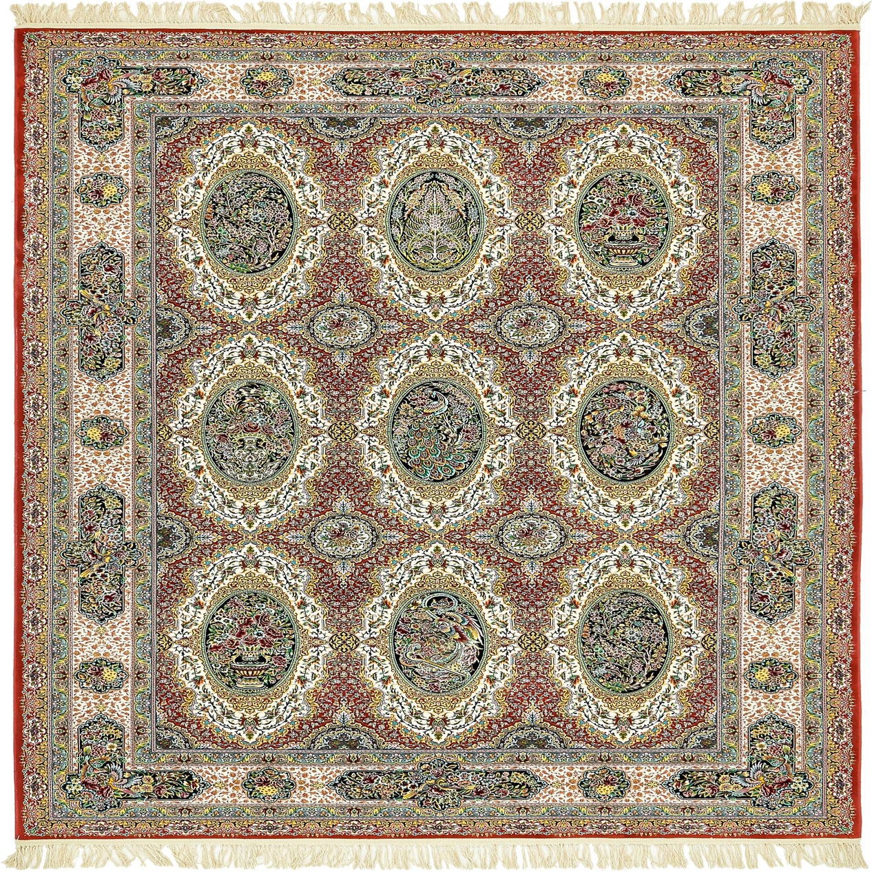 Primary color is Red. Colors in this rug include: Red, Black, Blue, Gold, Green, Ivory, Orange.