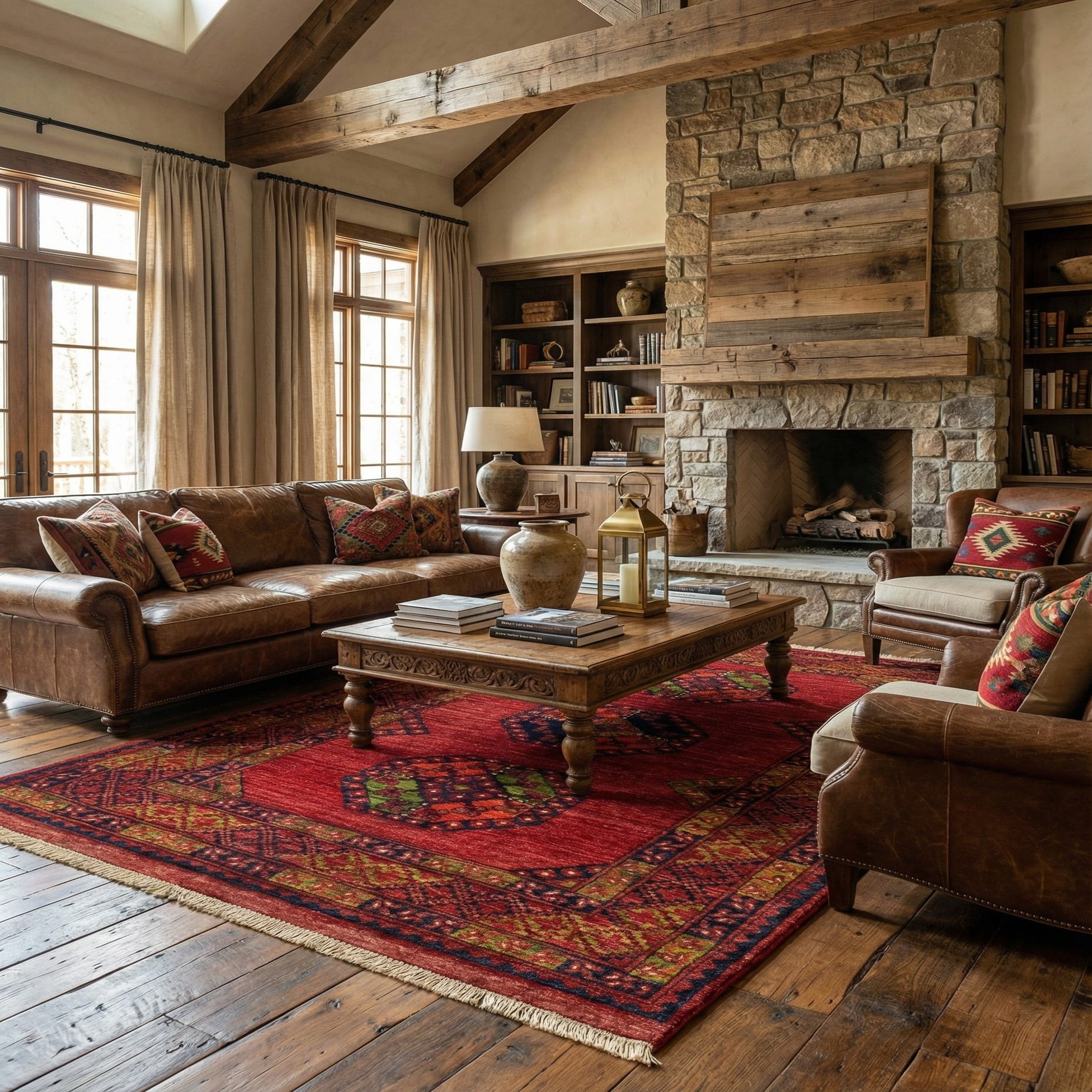 This rug works well as an anchor in a formal living room or a library, where its red field complements dark woods and leather seating. It also pairs neatly with neutral linen sofas in a transitional space to add color without overwhelming the scheme, or beneath a dining table to introduce pattern and depth on hardwood floors. For a layered, global-inspired look, combine it with woven throws, brass accents and textured cushions.