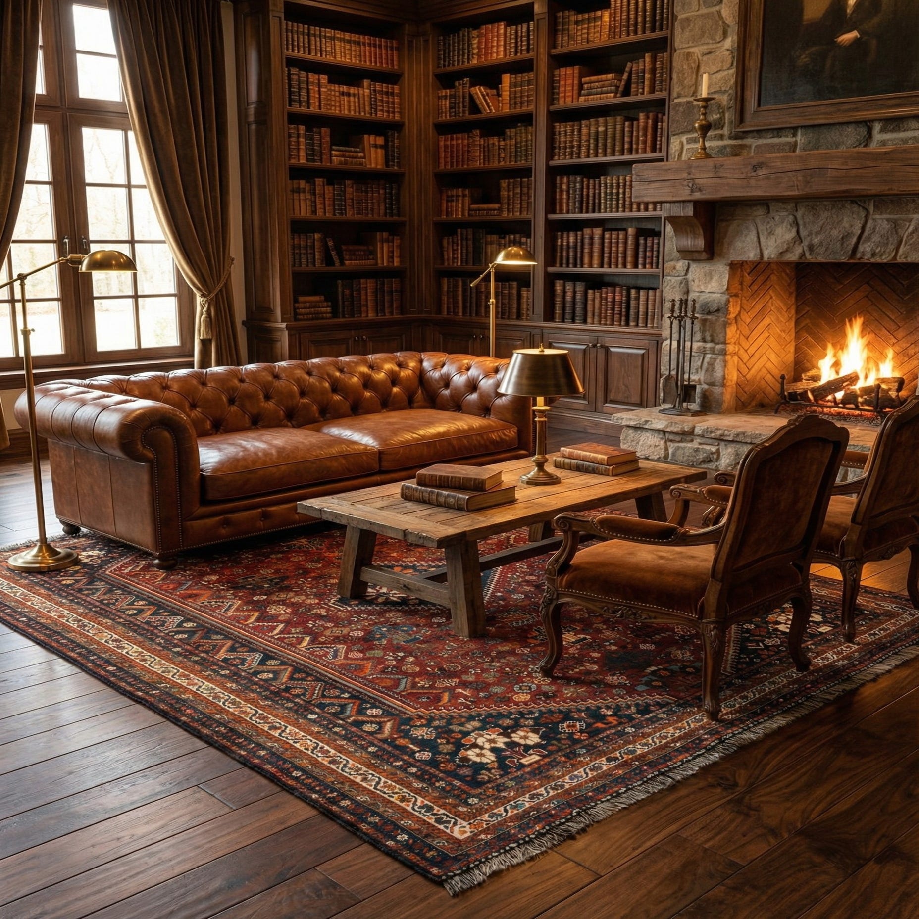 A rectangular 7x10 Ghashghai wool rug with a rich red field and intricate traditional patterns in blues, oranges, and creams, featuring a central medallion.