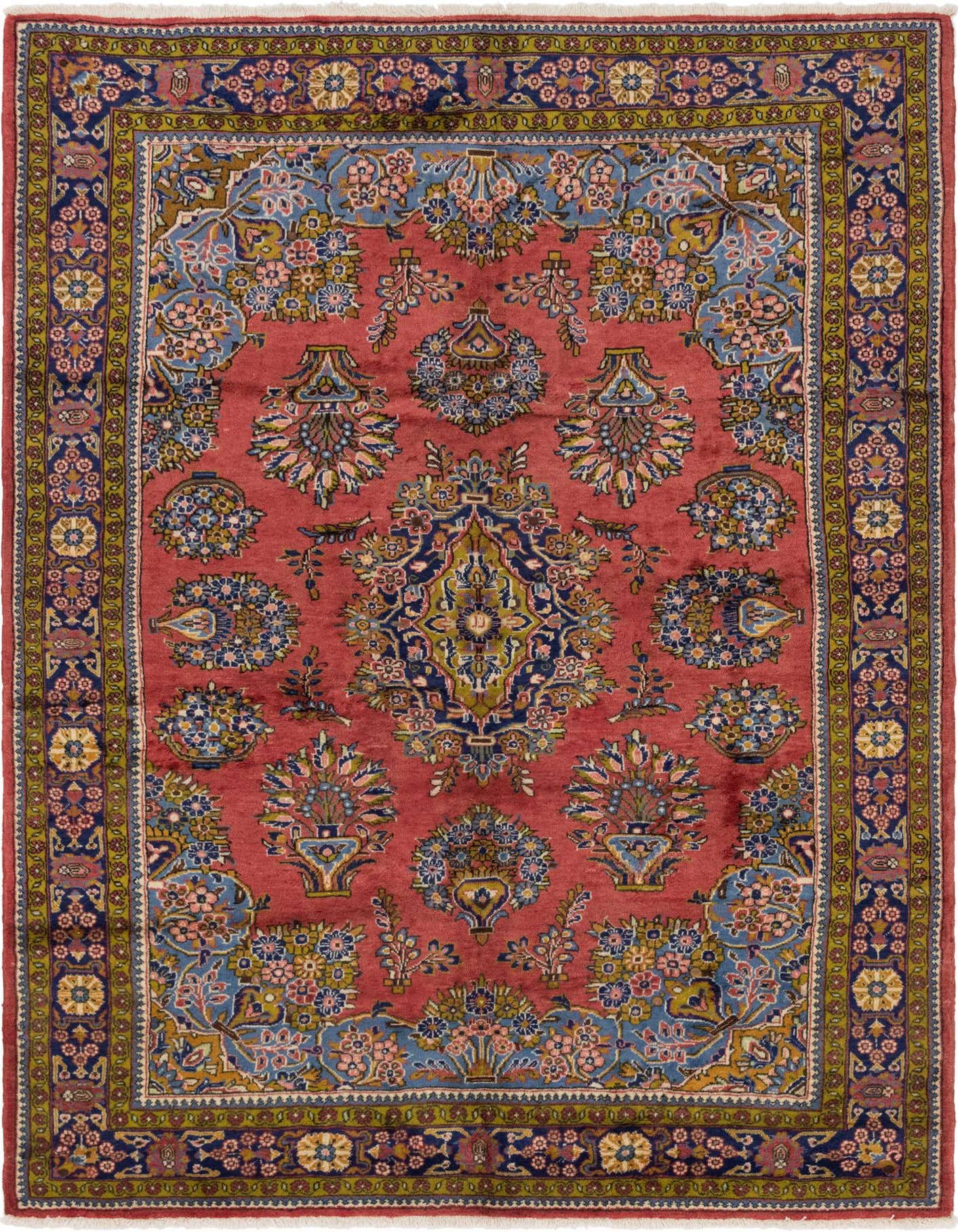 Primary color is Red. Colors in this rug include: Red, Beige, Black, Blue, Brown, Gold, Green, Ivory, Navy Blue, Yellow.
