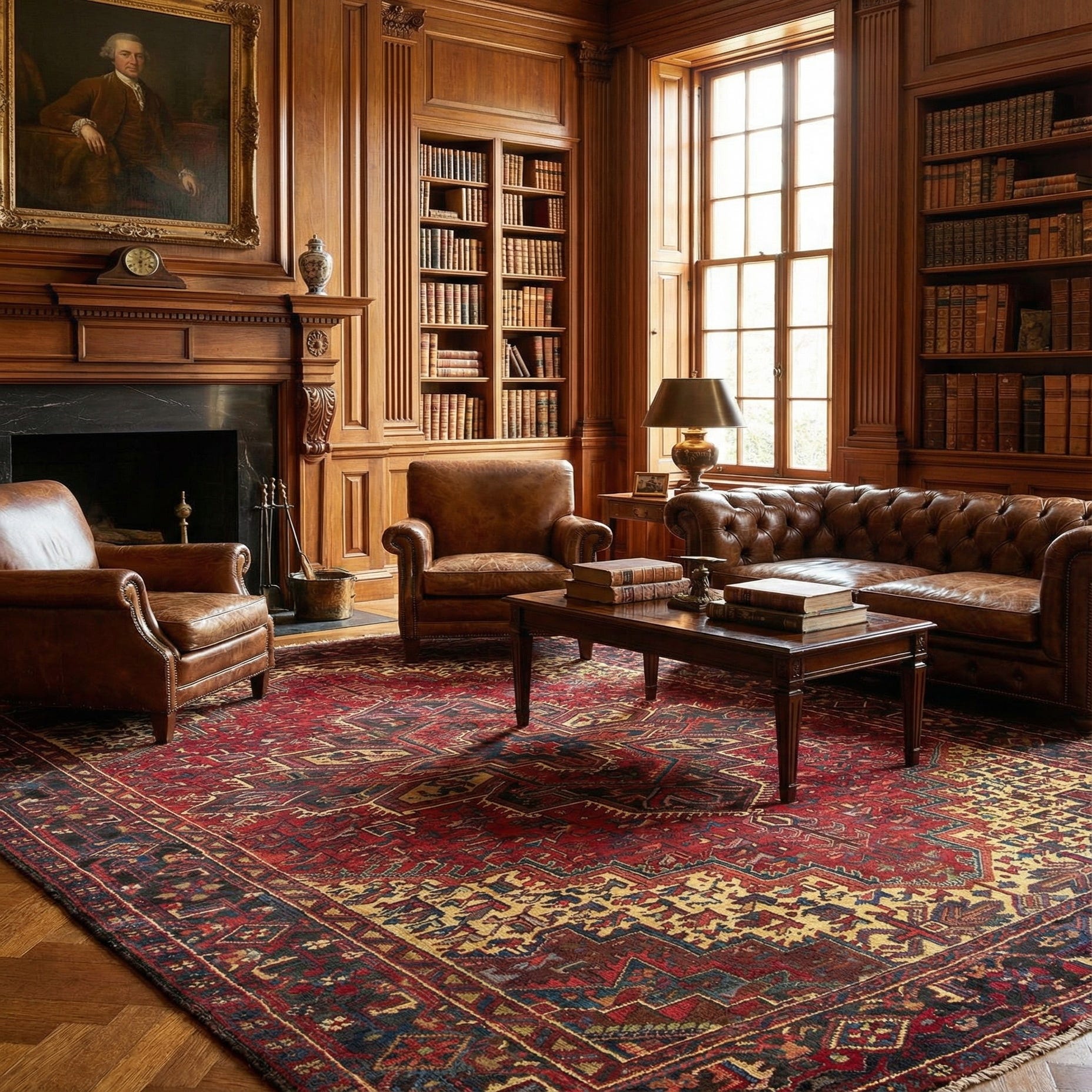 A 7x10 rectangular Heriz Persian wool rug featuring a central medallion and intricate geometric patterns in shades of red, navy, and cream.