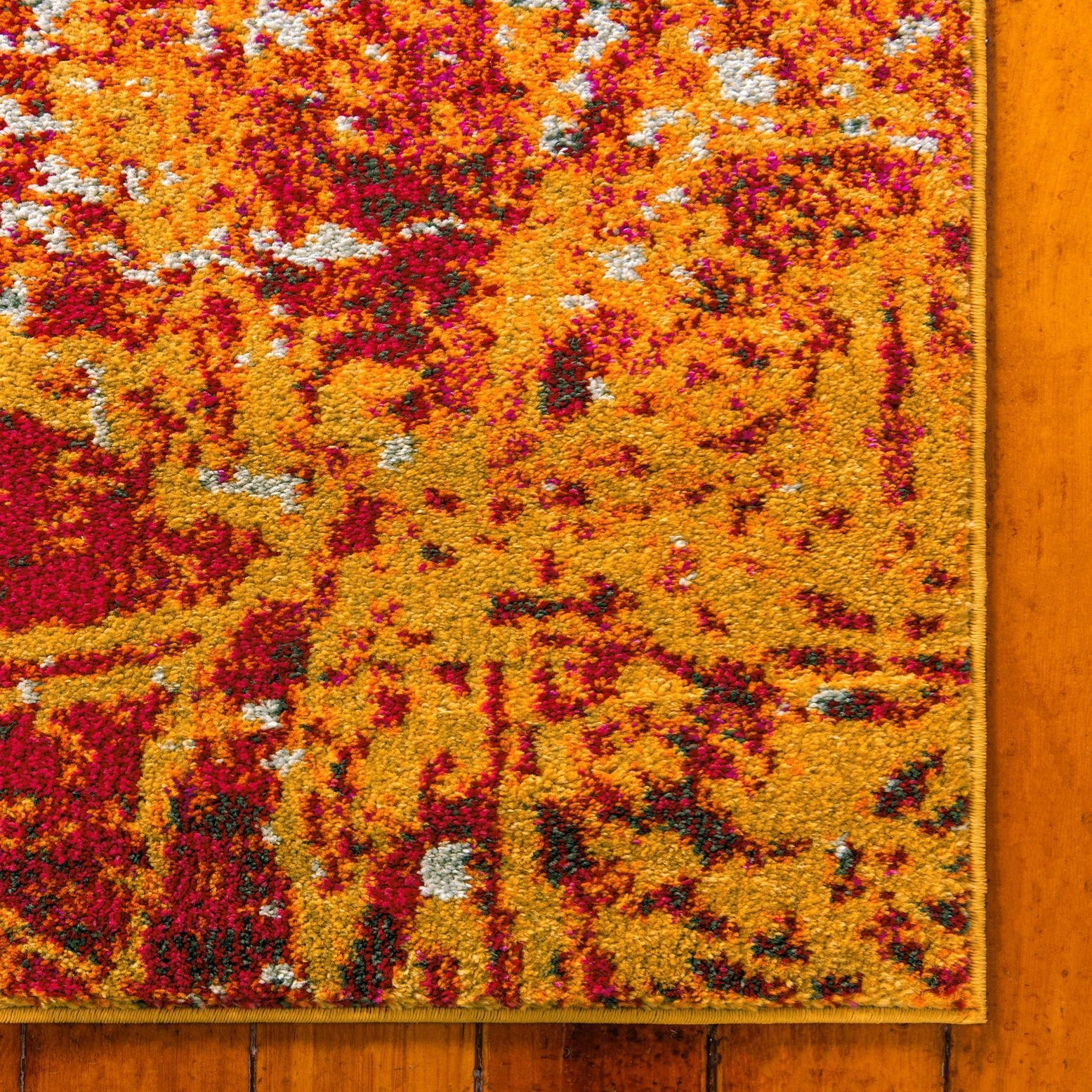 A lively, abstract pattern unfolds across a deep red ground, layered with painterly specks and distressed motifs that form a loose, mirrored center. Warm oranges and yellows pulse through the field, while accents of puce and pink add unexpected depth. Flecks of cream, beige, brown and gray break up the color, creating a textured, worn look that reads like a contemporary reinterpretation of a traditional medallion design. Running your hand over the surface you notice a low, tight pile with a smooth, slightly cushioned feel.