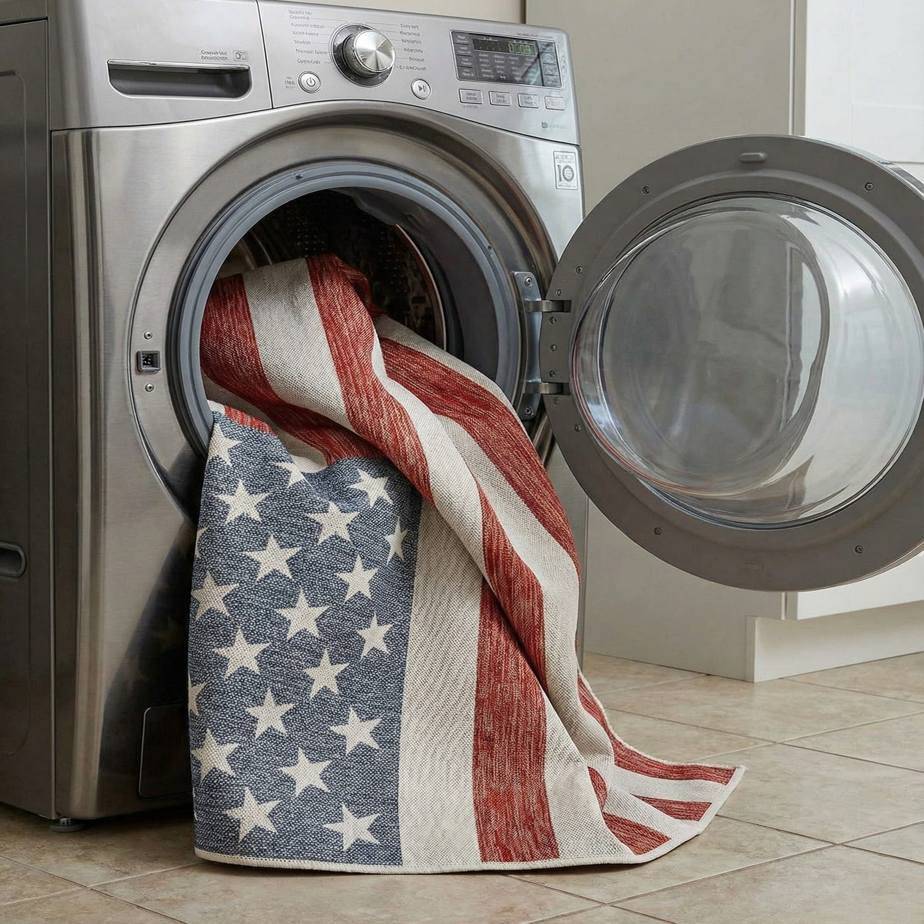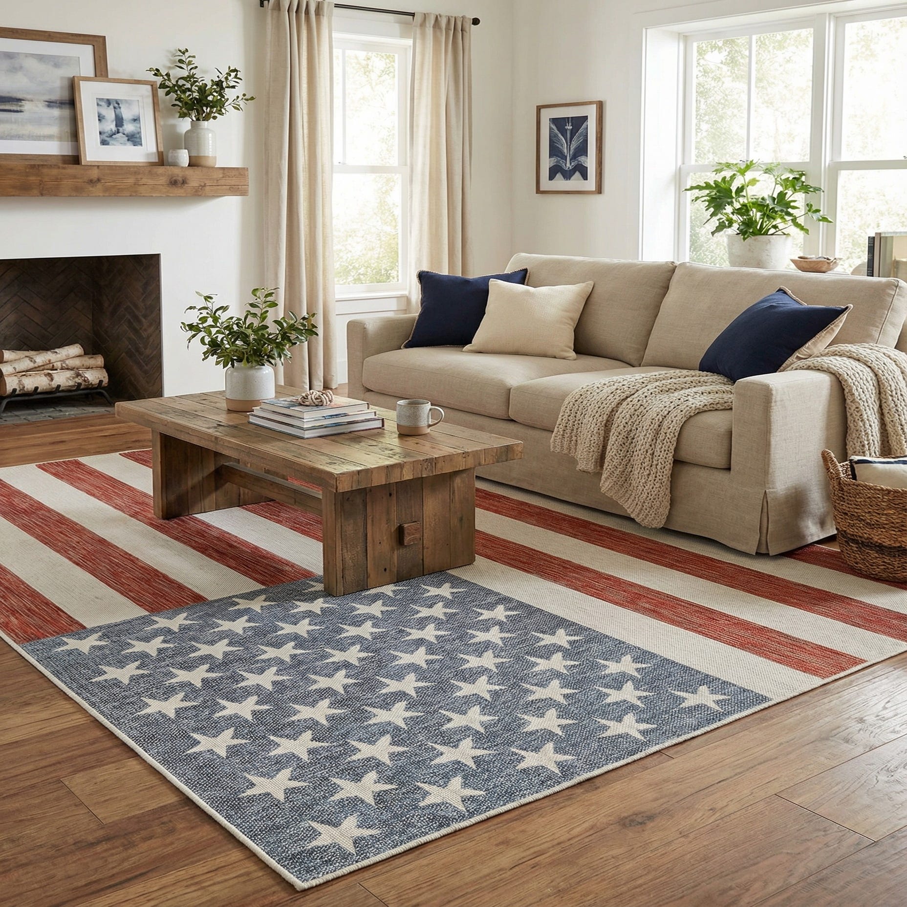 A bold, flag-inspired motif sits on a red ground with alternating ivory vertical stripes and a blue canton filled with evenly spaced ivory stars. The color story—red, blue and ivory—creates a classic, restrained look that plays well with both casual and coastal palettes. Machine made from 100% polypropylene, the rug has a low-profile, tightly woven construction and a subtle striated texture in the red yarns that you can feel beneath your feet and see close up.