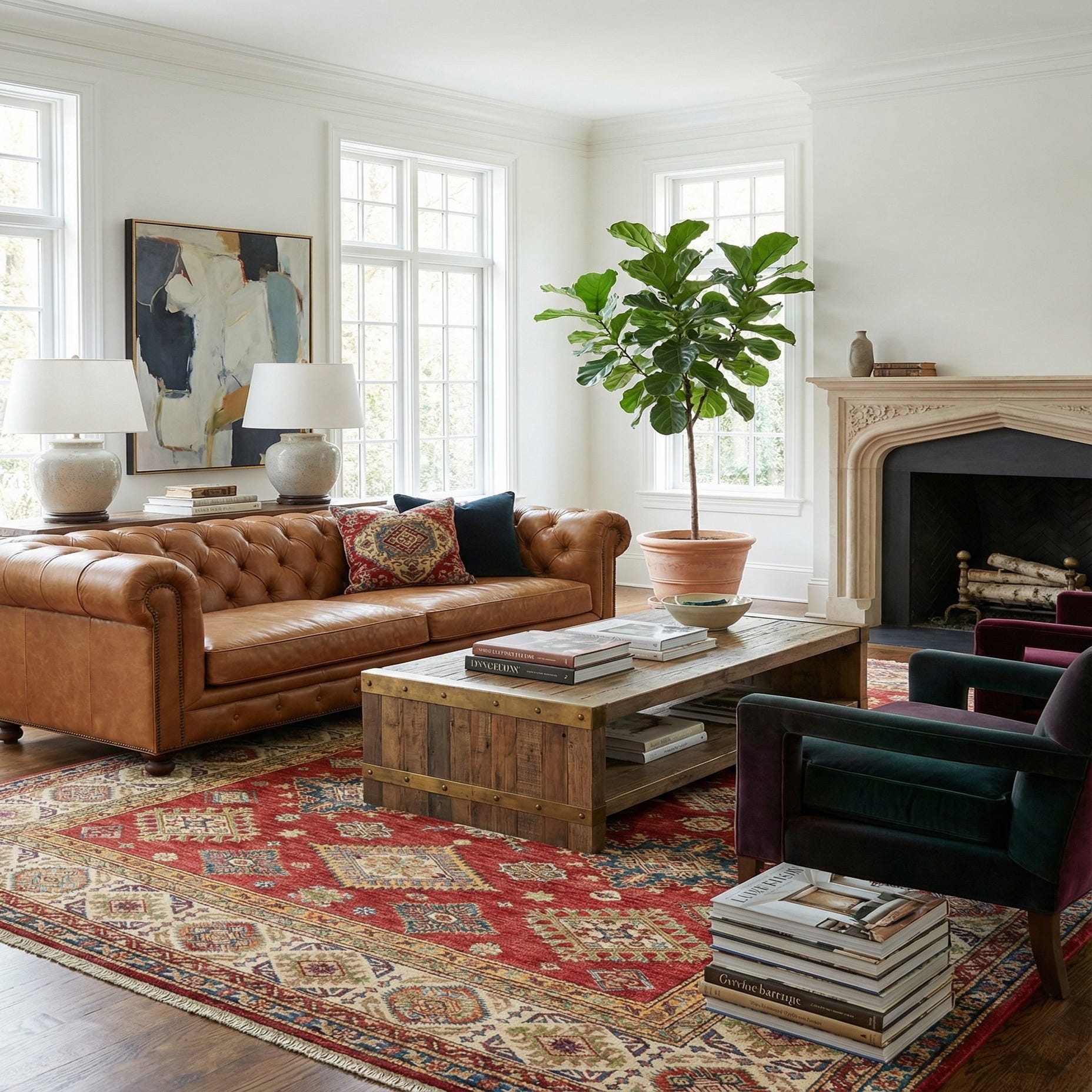 A 7x10 rectangular red Persian wool rug with intricate geometric patterns in blue, green, and gold, framed by a cream border.