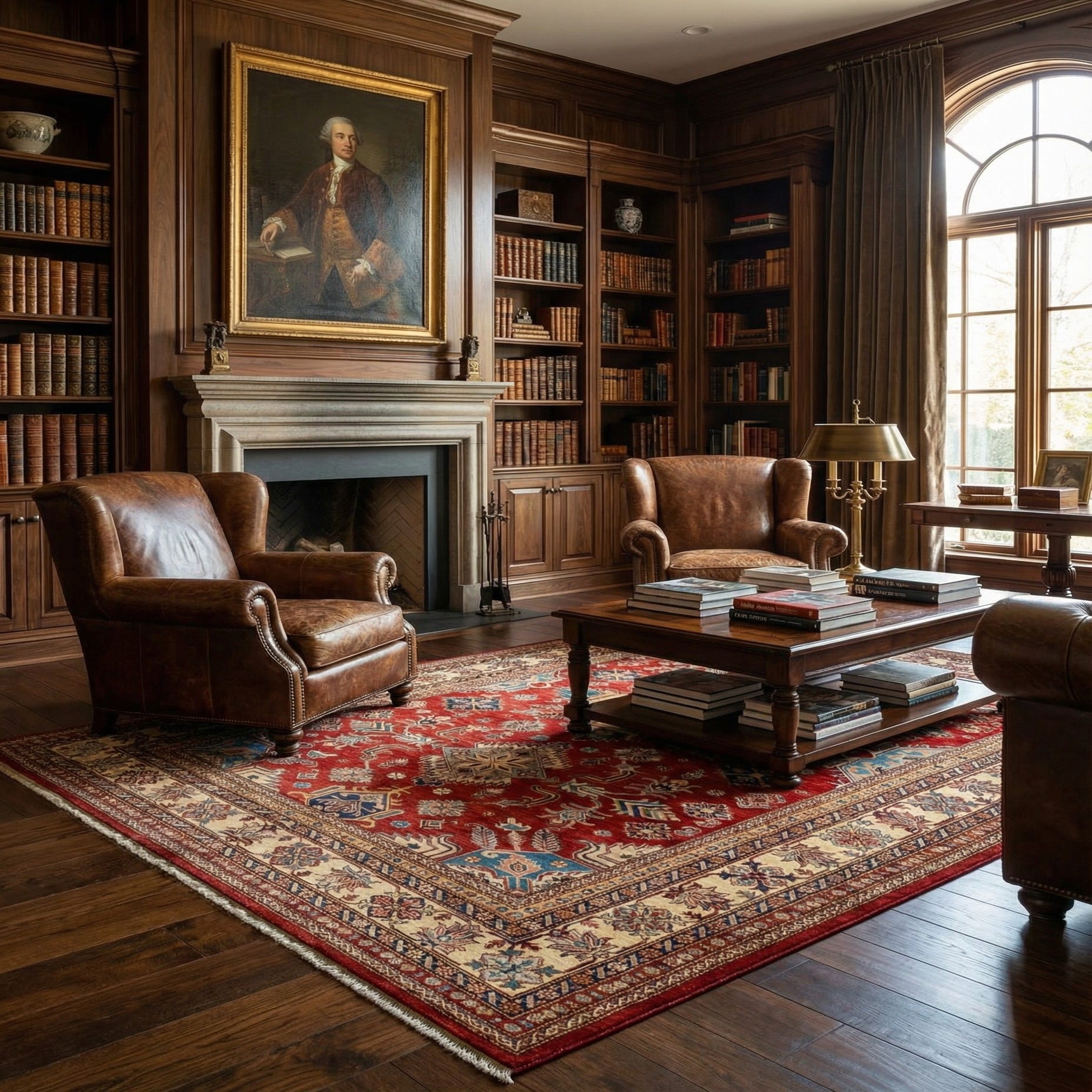 This rug would be well suited for interiors that aim to project warmth and timeless elegance. It pairs splendidly with wood furnishings and can complement both contemporary and classic décor. Ideal settings include a living room or dining area where its intricate pattern can serve as a captivating centerpiece. Furthermore, in a study or home office, this rug can add a sense of formality and sophistication.