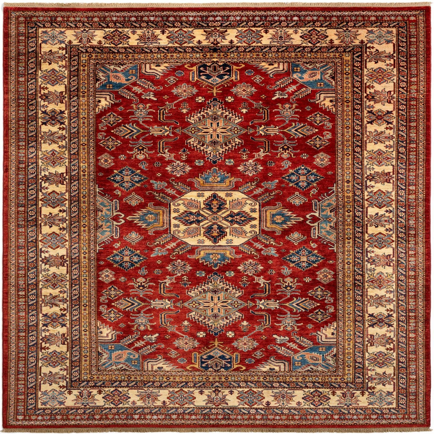 This Kazak collection rug is handcrafted from 100% wool, offering a durable and textured surface. It measures 7x10, making it versatile for various room sizes. The design exhibits a traditional aesthetic, embodied by its symmetrical geometric patterns and richly detailed borders. Rich shades of red form the rug’s foundation, supplemented with accents of beige, cream, dark blue, and lighter blue hues, creating a cohesive and inviting color palette.