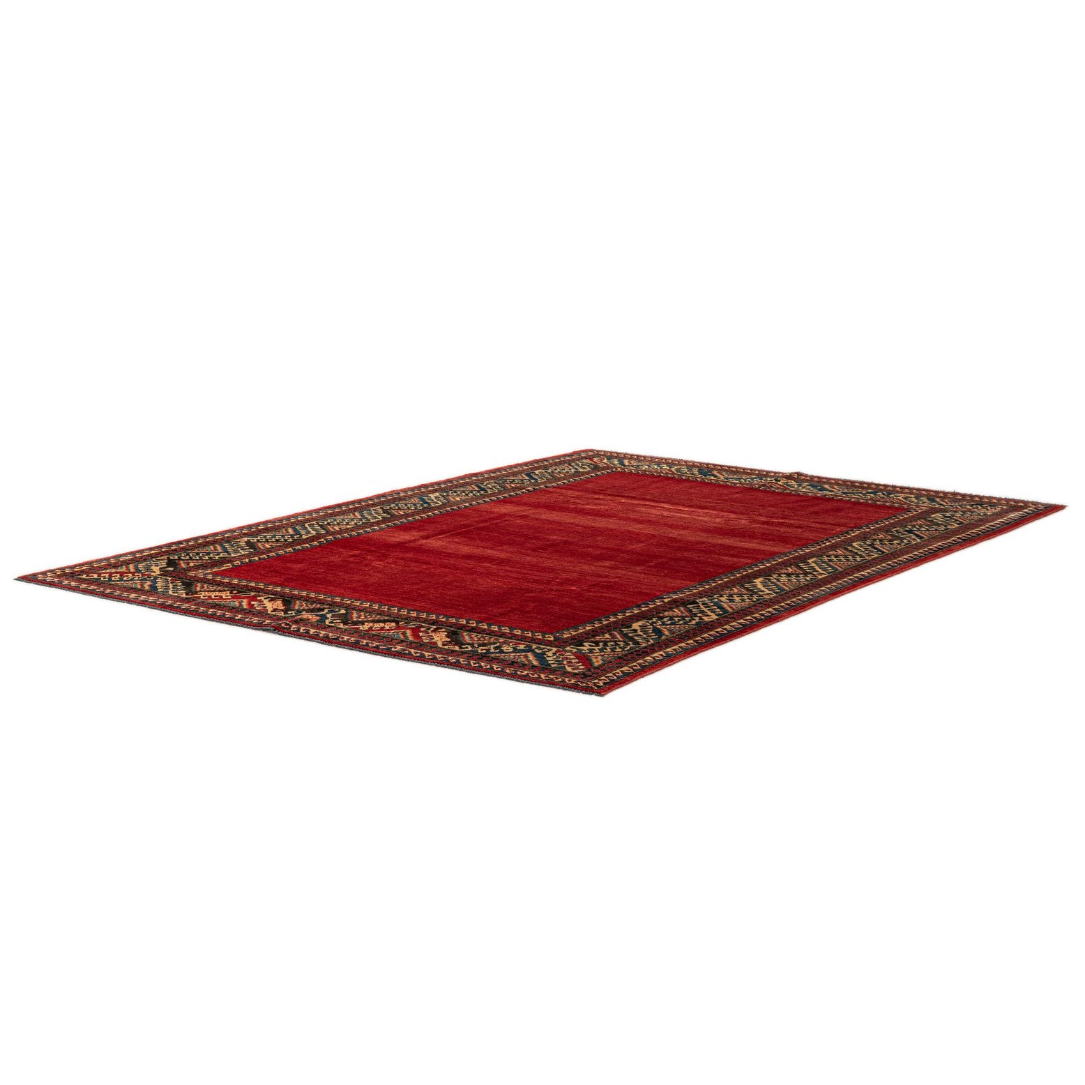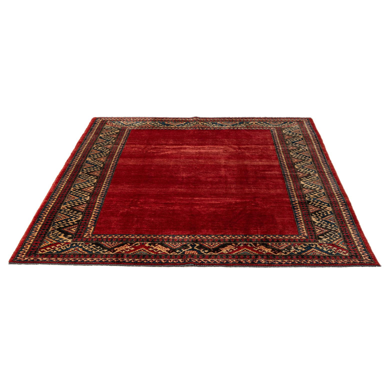 A deep red field forms a warm, inviting foundation, framed by a series of geometric guard borders in beige, black, blue, brown and green. The pattern is a classic tribal arrangement — stepped motifs and repeating angular medallions run through the borders while the central area remains intentionally spare, letting the rich color and subtle tonal variations of the wool take center stage. Hand-knotted in 100% wool, the surface has a dense, low-to-medium pile with a soft, velvety nap and a slight natural luster that highlights the handcrafted knotting and gives the rug a tactile, substantial feel underfoot.