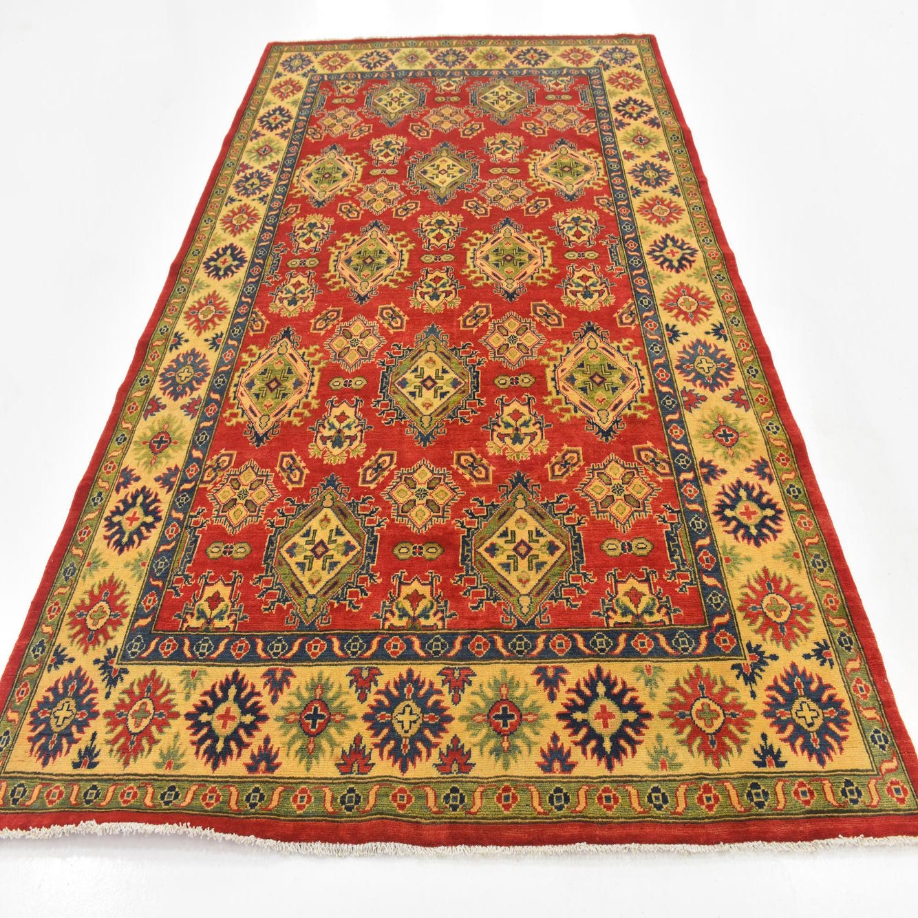 A 7x10 rectangular red Kazak rug with traditional Southwestern patterns and a gold border, ideal for a living room.