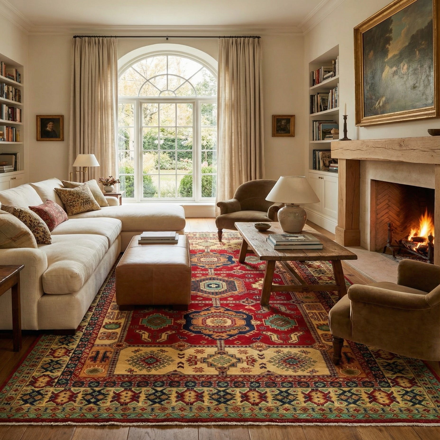 A 7x10 rectangular Kazak rug with a vibrant red field and intricate traditional patterns in beige, blue, and orange.
