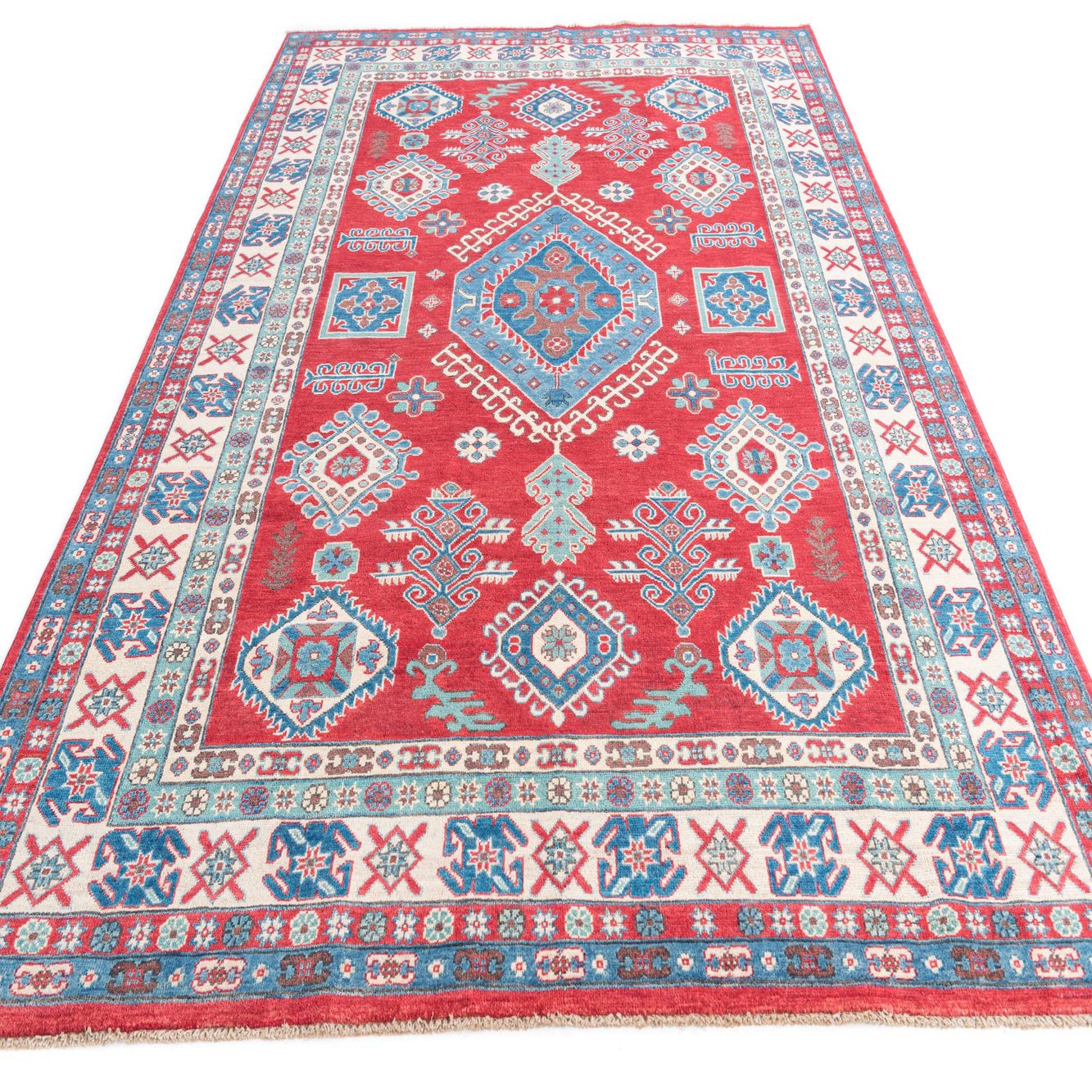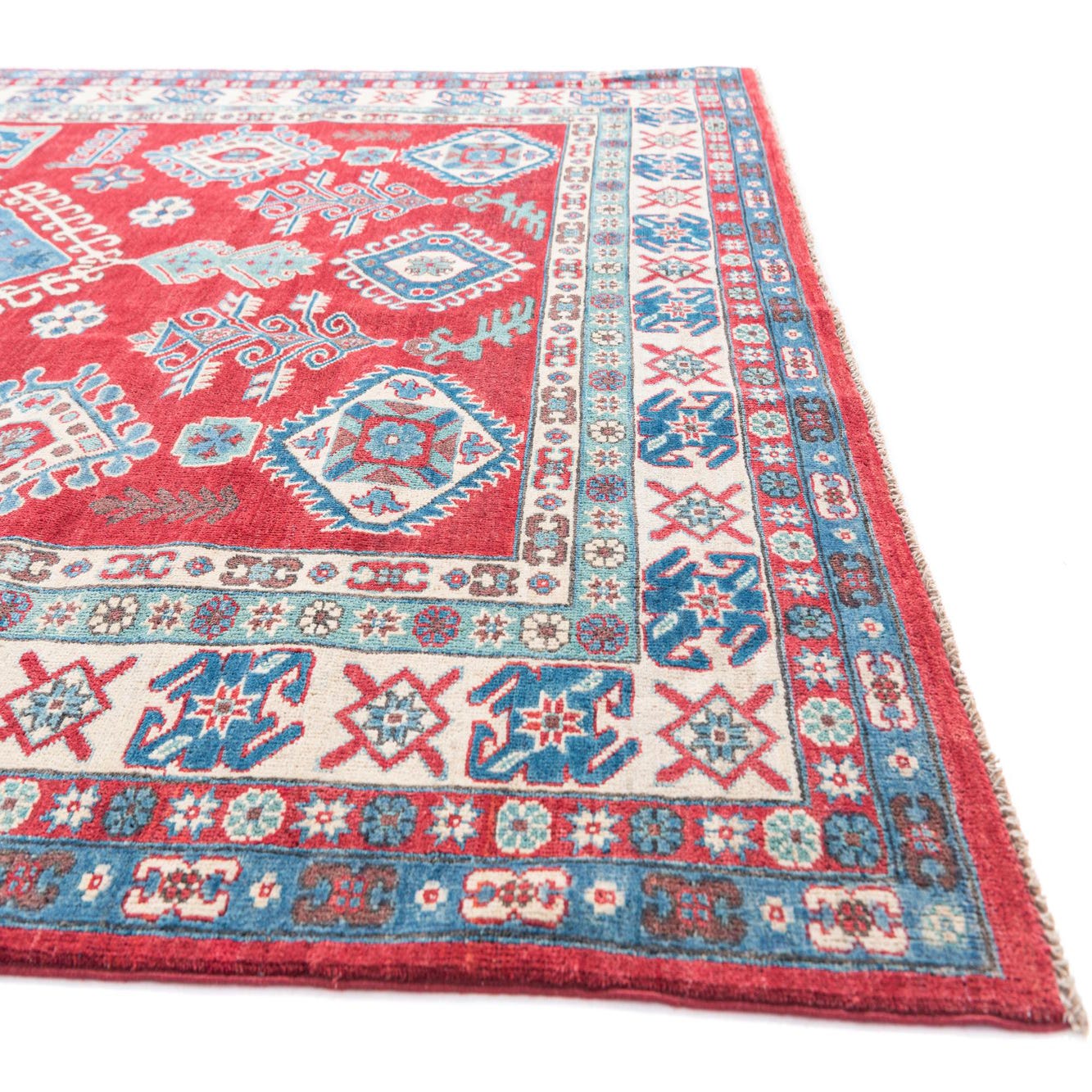A 7x10 rectangular red Kazak rug with traditional Southwestern and Oriental patterns in blue, teal, and cream.