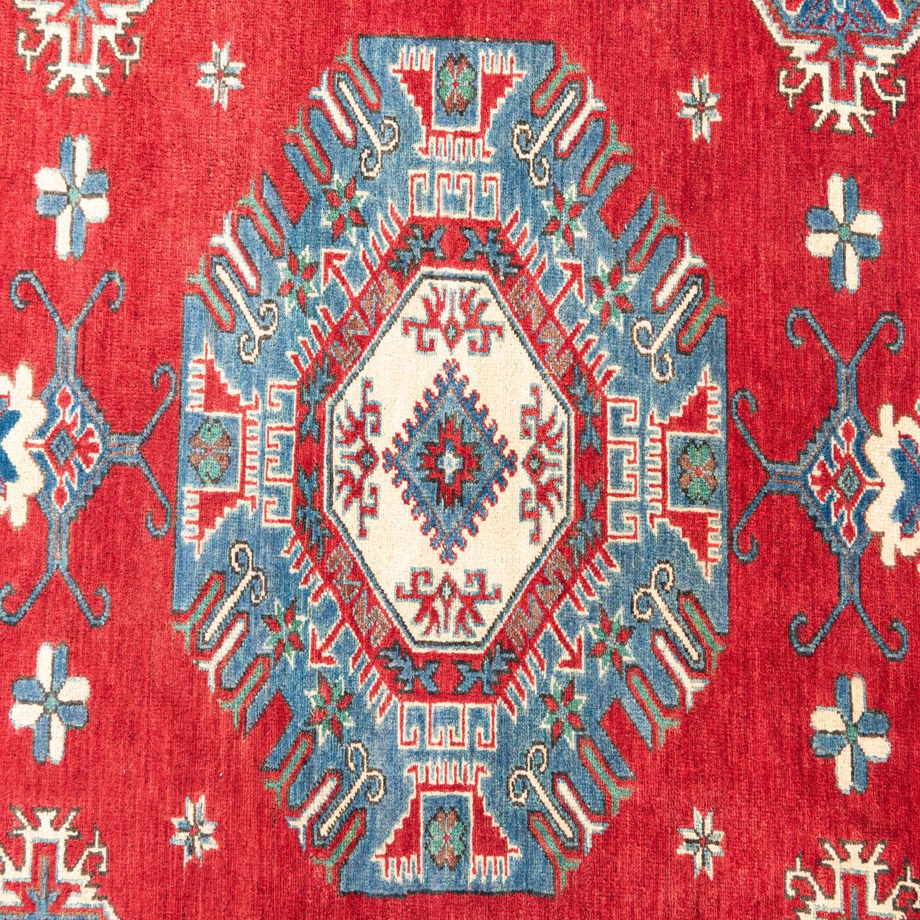 A 7x10 rectangular red Kazak rug with a central medallion and geometric patterns in blue, green, and beige.