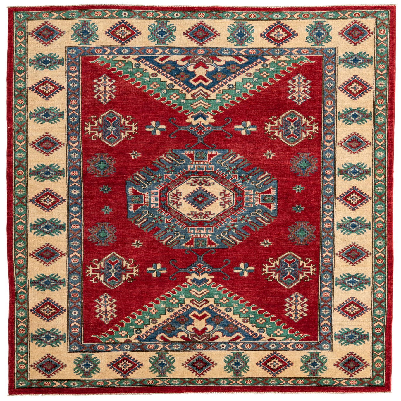 The Kazak collection rug is a hand-knotted masterpiece crafted from 100% hand-spun wool for a natural, robust texture. This 7x10 area rug boasts a dominant red background punctuated by a rich tapestry of colors, including shades of beige, blue, brown, navy blue, and green which come together in a symphony of traditional geometric patterns and motifs. The intricate central medallion anchors the design flanked by smaller decorative elements, imbuing the space with a sense of balance and formality.