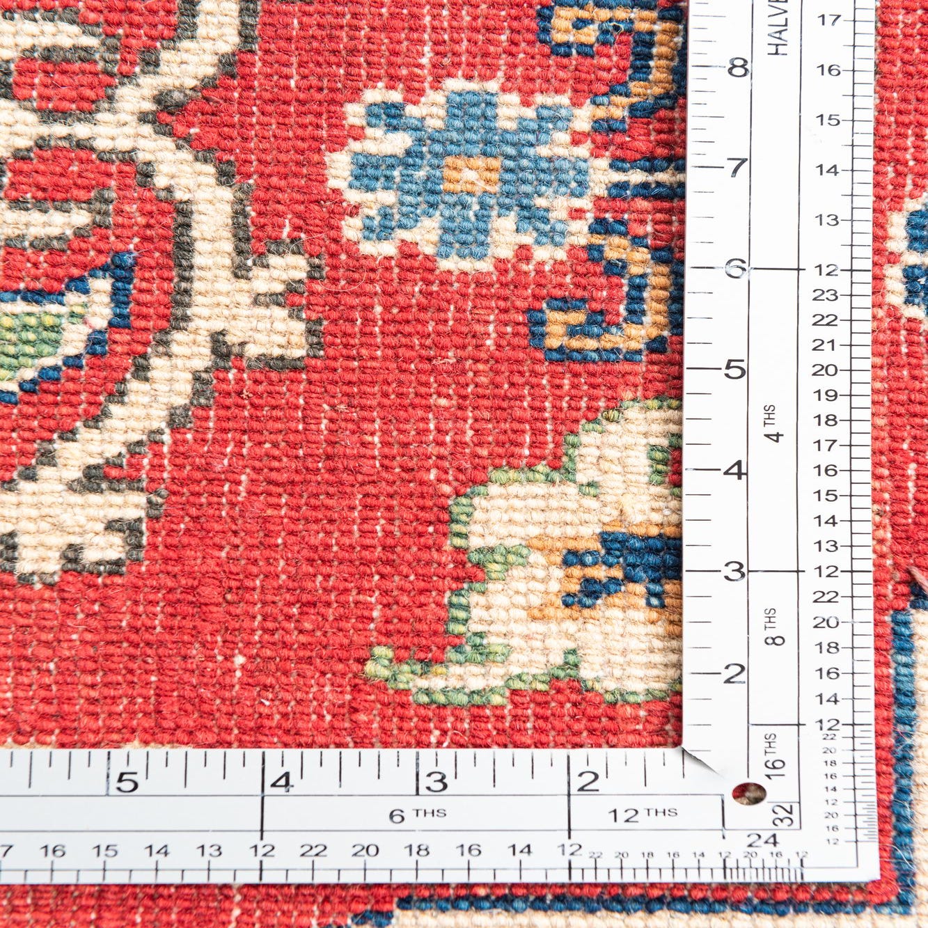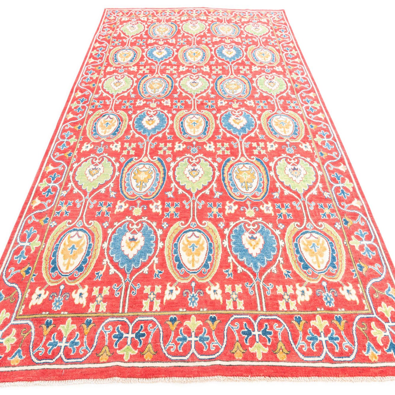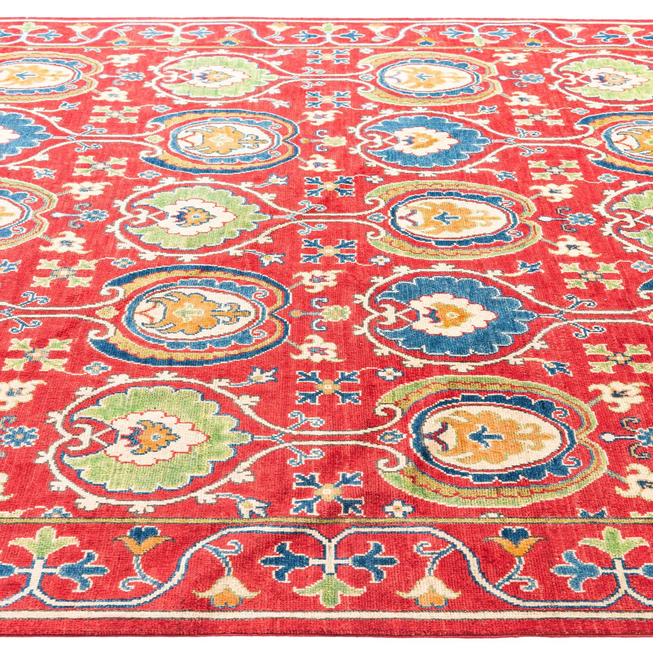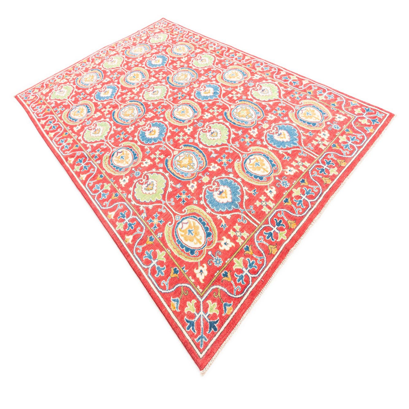 The Kazak collection presents a 7x10 hand-knotted rug crafted from 100% hand-spun wool, offering a dense and plush texture underfoot. This rug features a vibrant red background, accentuated by a harmonious arrangement of geometric and botanical motifs rendered in an array of colors including blue, brown, yellow, green, and ivory. The intricacies of the pattern are highlighted by the bold contrasts and the traditional design, inspired by classic Kazak styles.