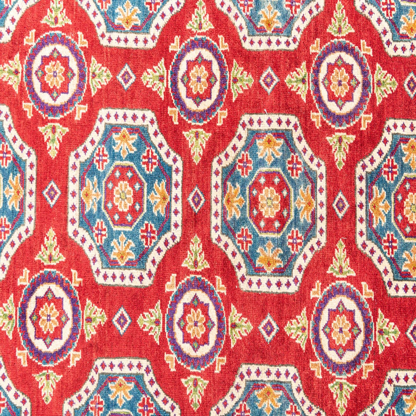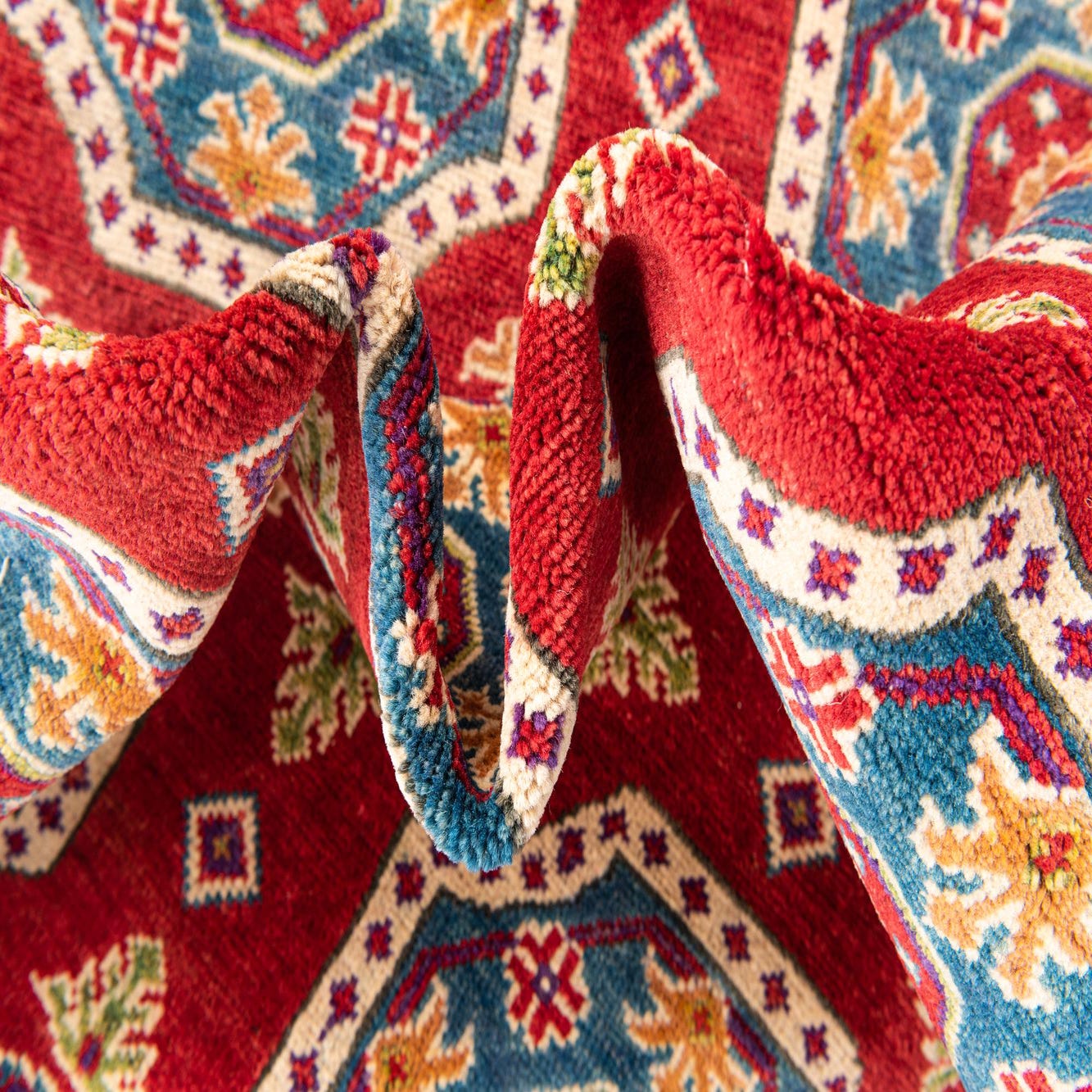 This Kazak collection rug features a distinctive pattern that draws on traditional geometric motifs, hand-knotted from 100% hand-spun wool for durability and a soft feel. Its design showcases a vibrant red background with a harmonious mix of beige, blue, brown, green, yellow, and navy blue detailing. Each ornamental medallion is intricately framed, creating a sense of elegance and symmetry.