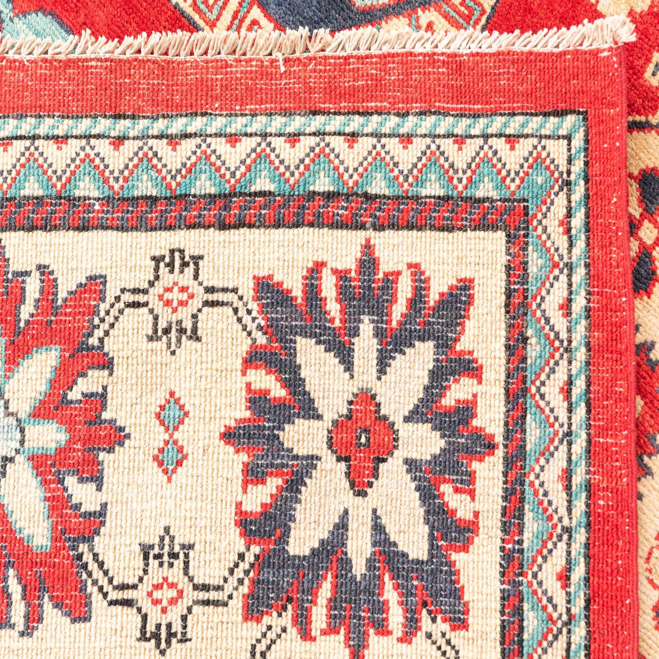 A 7x10 rectangular red Kazak rug with traditional Southwestern and Oriental patterns, featuring a central medallion and intricate borders in cream, navy, and light blue.