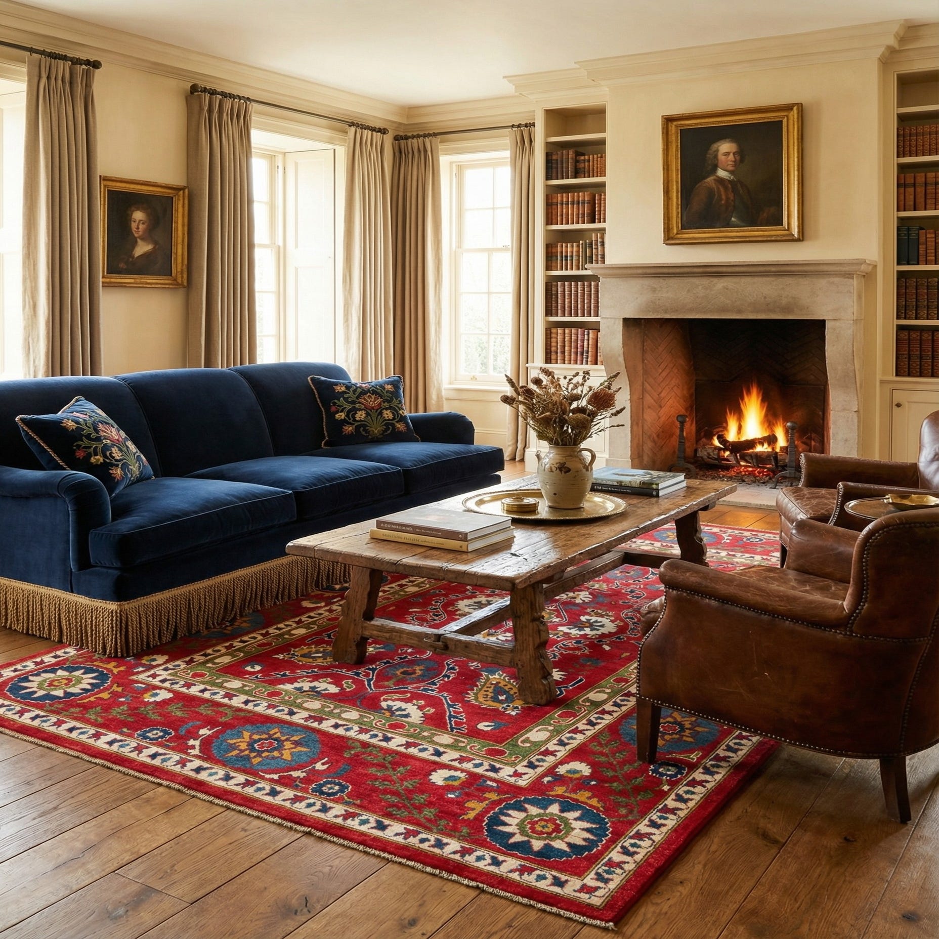 Complementing both dark wood tones and lighter, airy spaces, this rug can effortlessly integrate with a wide range of interior styles, including rustic, traditional, and eclectic. It can also serve as a sophisticated contrast in a more modern room, providing a pop of color and pattern that brings warmth and character to contemporary decor.