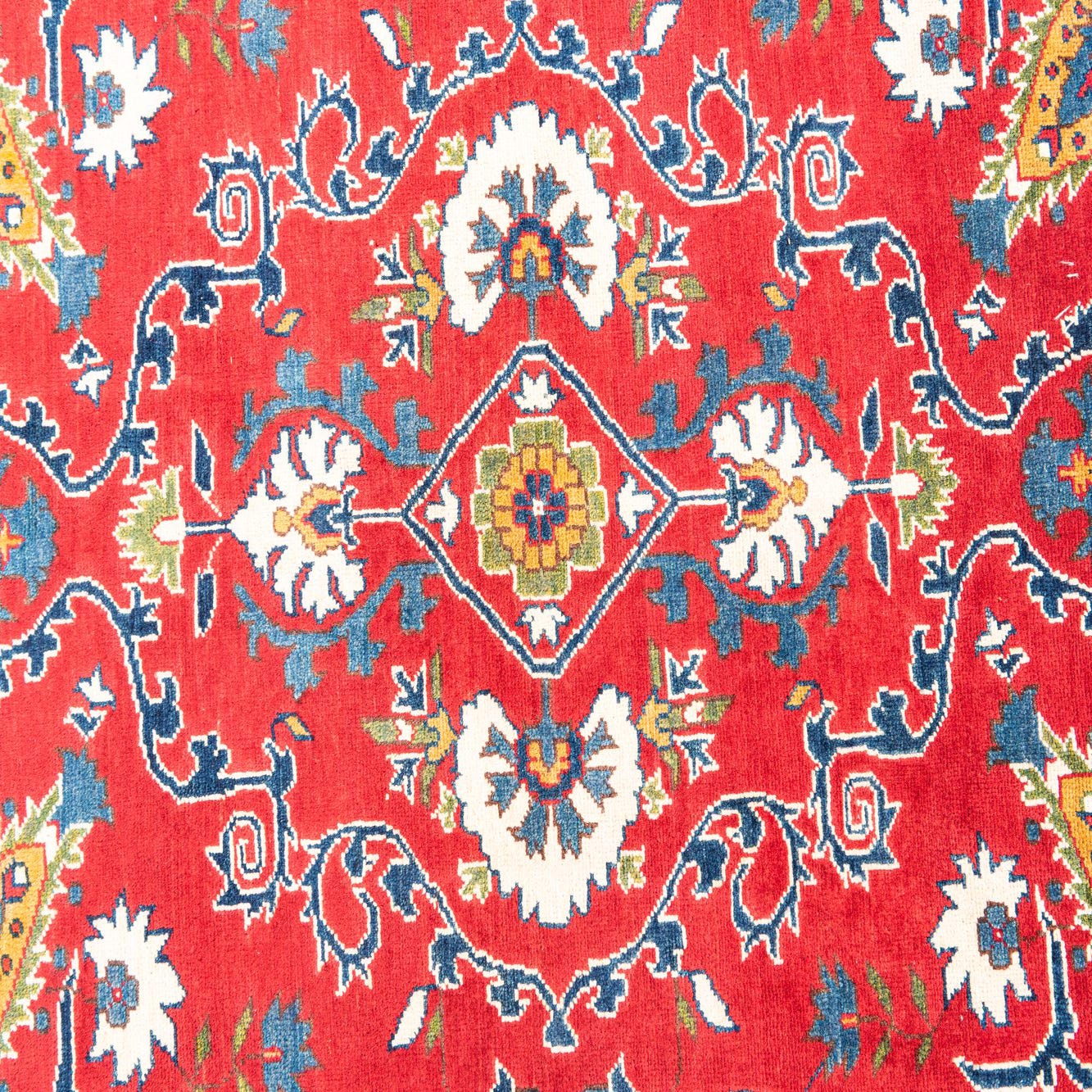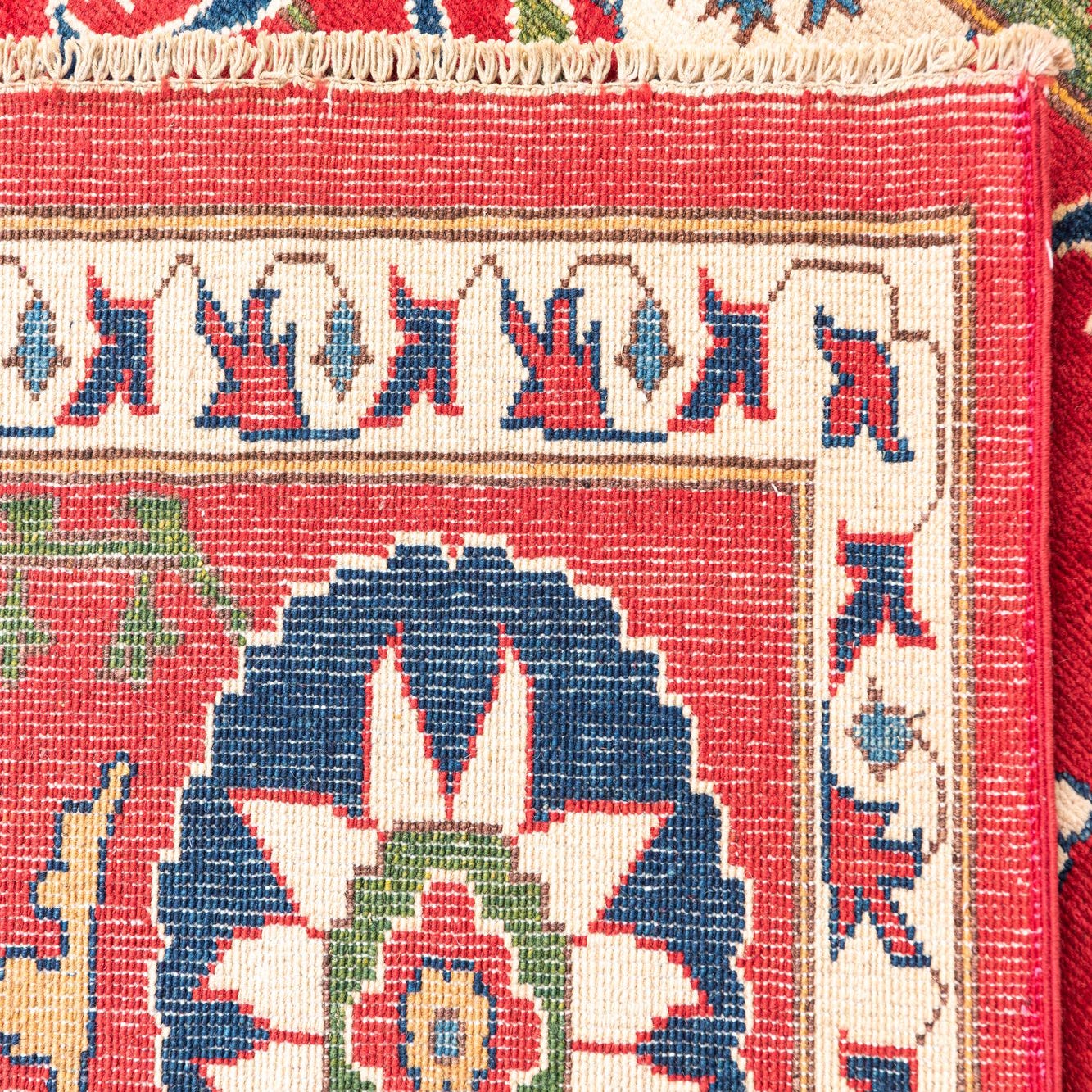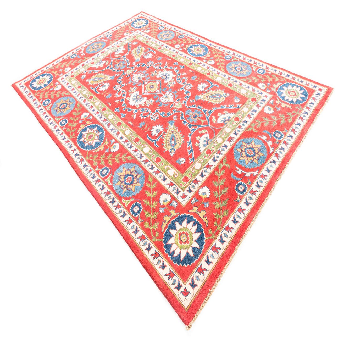 A 7x10 rectangular red Kazak rug with intricate traditional Southwestern and Oriental patterns in blue, yellow, green, and cream.