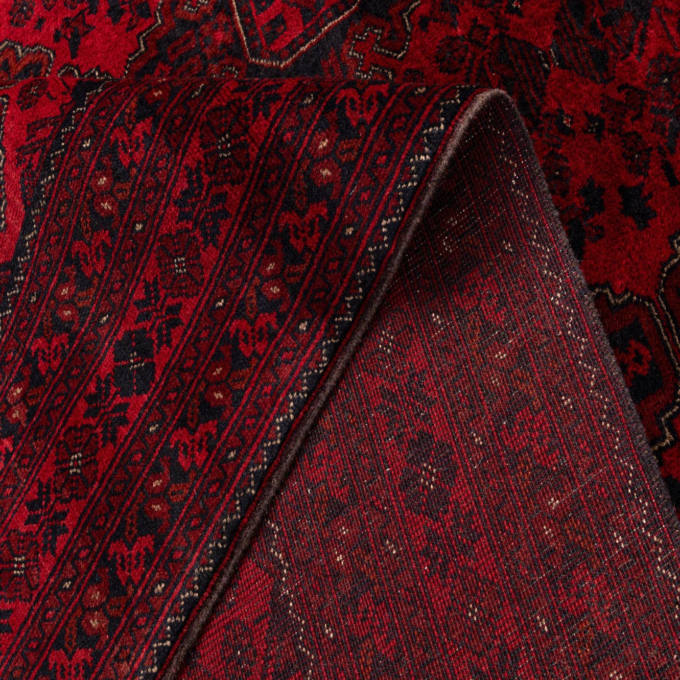 A 7x10 rectangular Rugs.com Khal Mohammadi rug in deep red with a repeating dark geometric pattern and intricate border.