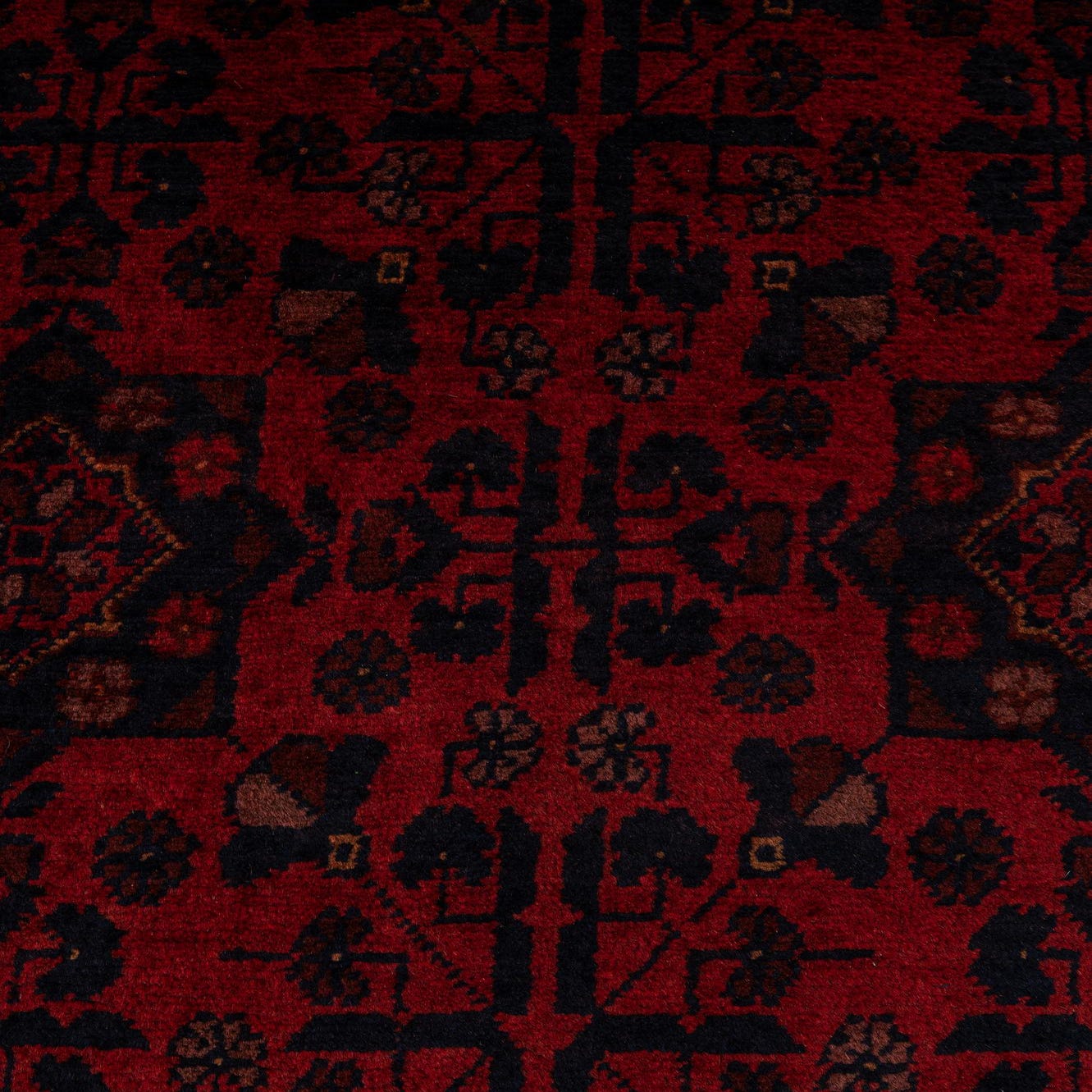 Primary color is Red. Colors in this rug include: Red, Black, Brown.